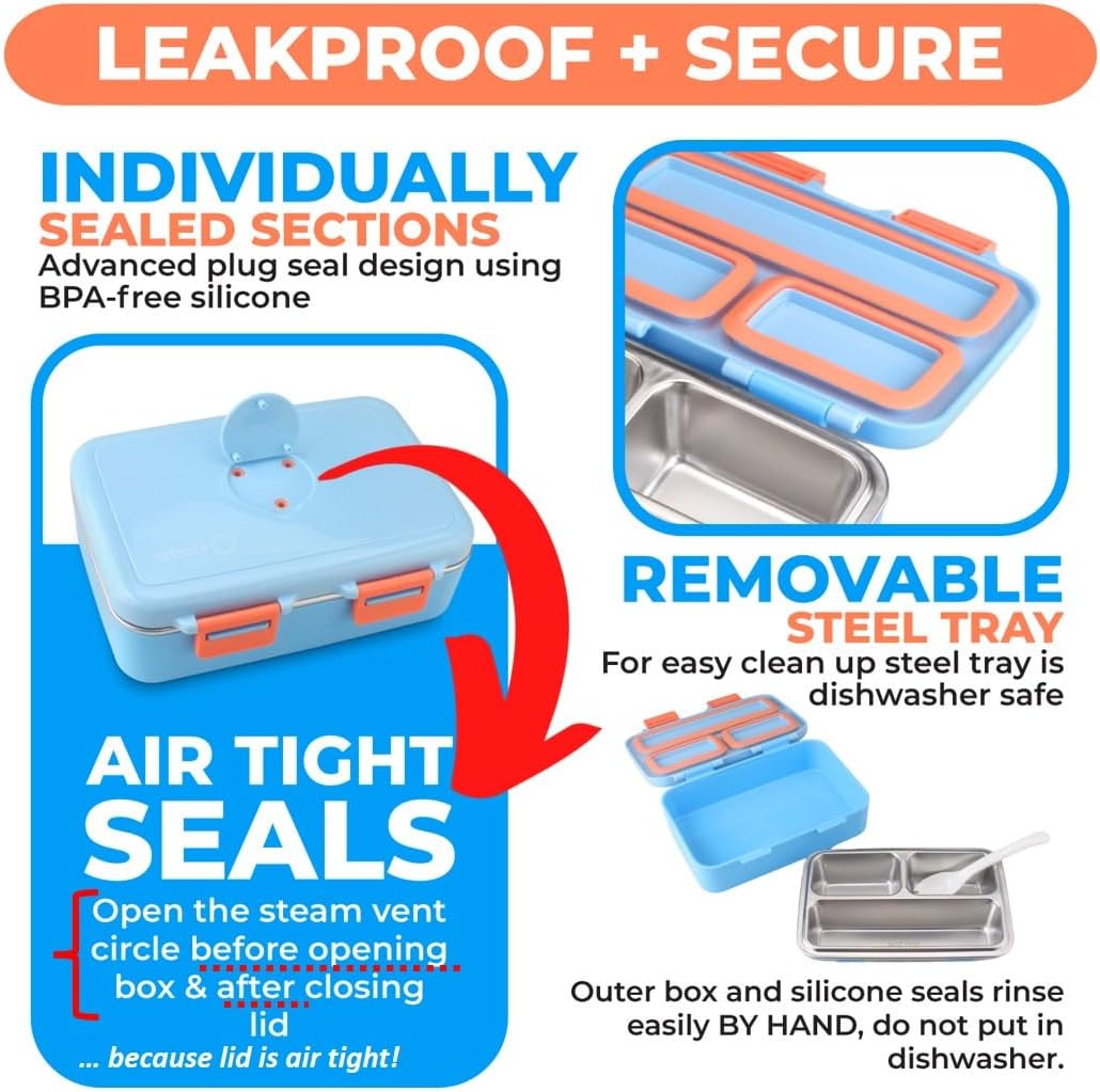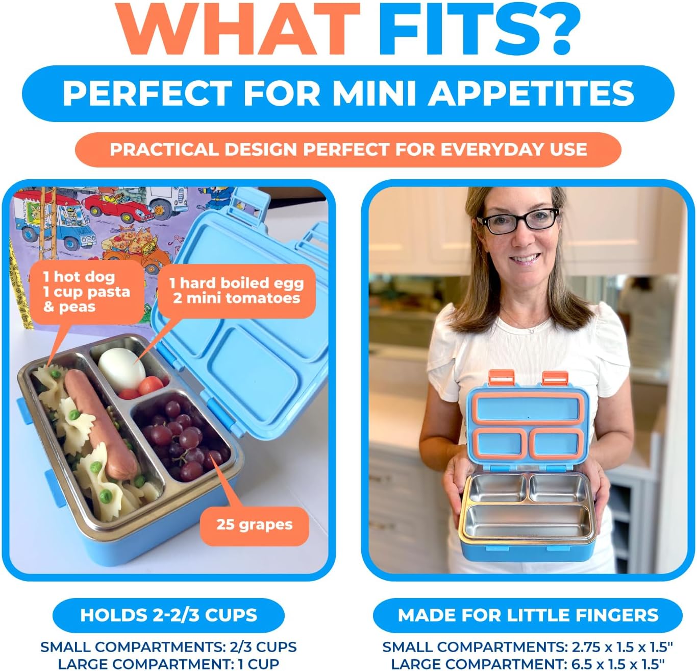 - New Upgraded Features! PREMIUM MINI Steel Bento Box β A fun way to send your toddlers, baby and young children to daycare or preschool with a healthy lunch. This travel-friendly lunch box features 3 stainless steel section compartments sealed individually with high-grade silicone seals to keep food fresh. Includes spork. BPA and phthalate free. AGE 3+