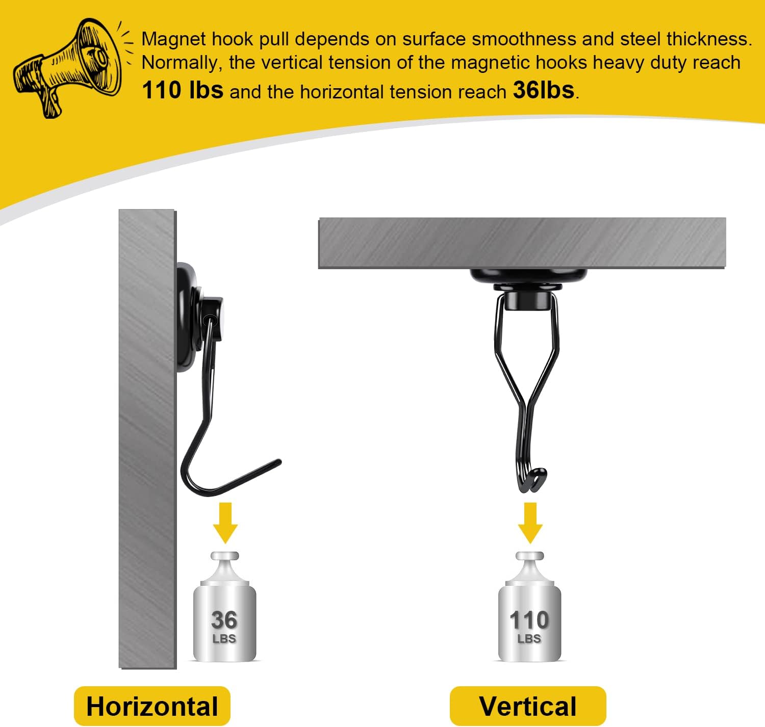 - 【 High Quality 】 The rotating swing magnetic hook heavy duty has a pulling force of 110 pounds and is based on horizontal applications - reducing by 2/3 if used vertically. The magnetic hook features a heavy and stable magnetic surface, with strong magnetism lasting forever!