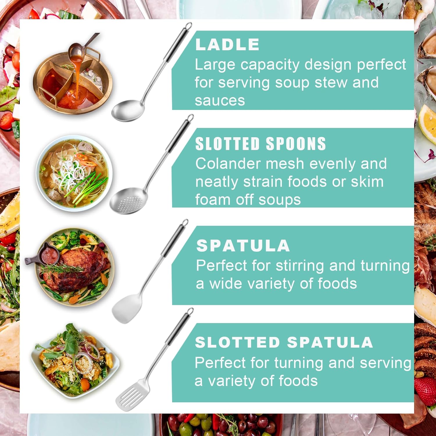 - 【Stainless Steel Material & Exquisite Craftsmanship】The spatula and spoon sets are made of stainless steel, which is heat-resistant, sturdy, anti-corrosion and rust resistance that provide you with long-term use. In addition, our kitchen utensils are manufactured through several processes, finely crafted to make the edges and surfaces smooth. Using the soup ladle spoon and metal spatula to serve soup and turn food will not ruin the original shape of the food or scratch your pan