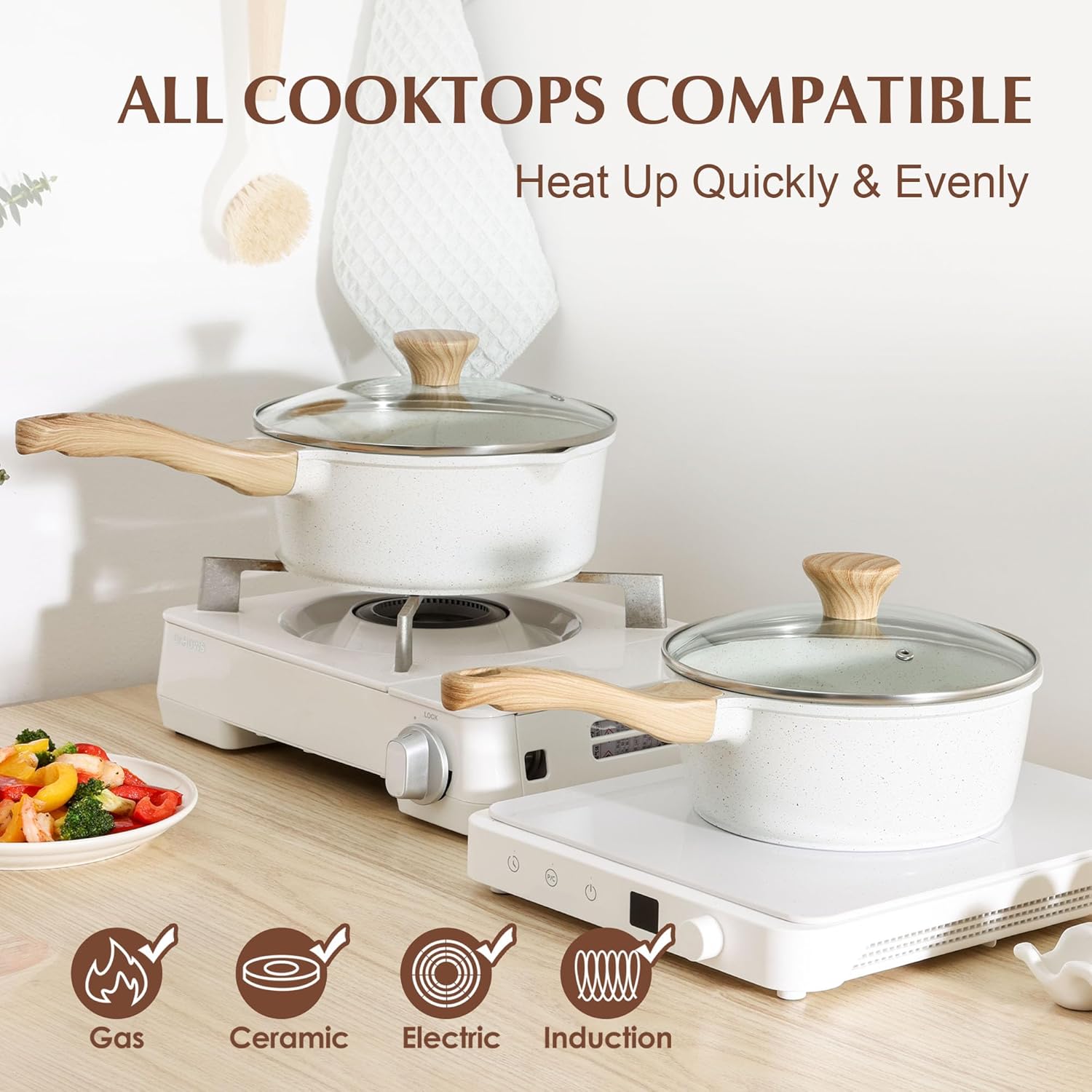 - Suitable For All Stoves - High magnetic conductive stainless steel base allows the 2.5 qt saucepan with lid nonstick to work on all cooktops, including induction. The core of small sauce pan stone is made of cast aluminum, which is sturdy, long-lasting and heats up quickly and evenly.