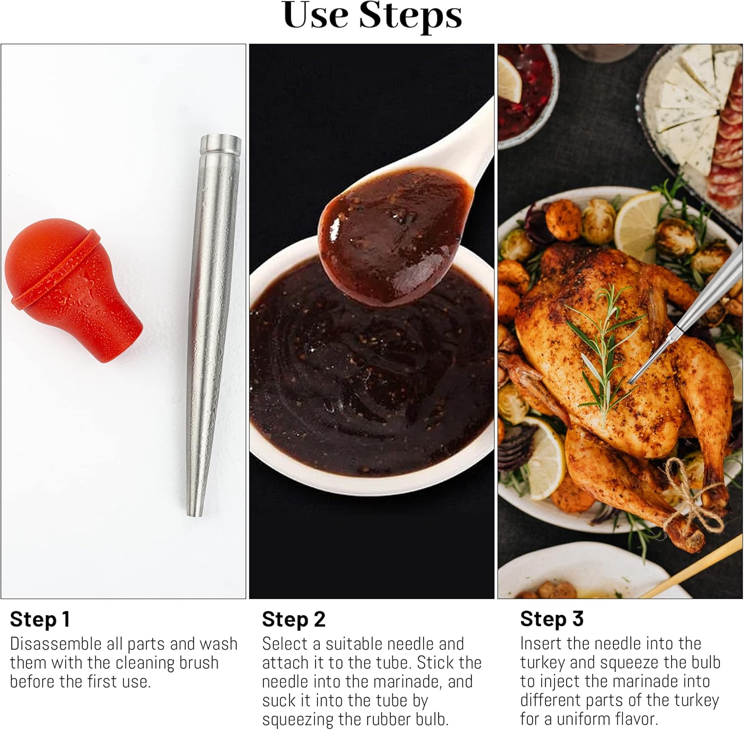- Turkey Baster Set: The turkey baster set contains 1 bulb, 1 stainless steel tube, 1 cleaning brush, and 2 different turkey injector needles for flavor, it's a good kitchen assistant for your next Thanksgiving or Christmas dinner.