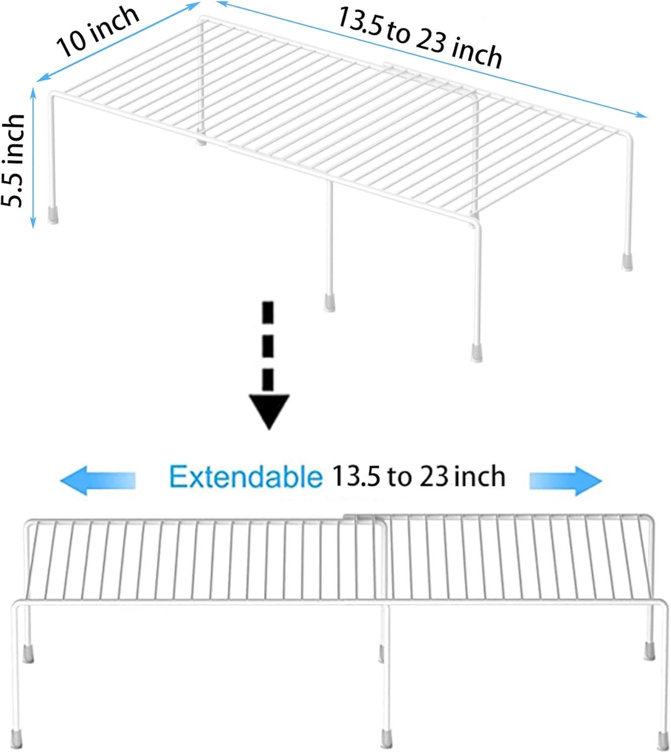 - EXPANDABLE DESIGN: The length of this shelf can be adjusted to your desire. It can vary from 13.5 inches to 23 inches in length depending on how you want to arrange your space. This product is tailor-made for customers who faces difficult product selections. Size:13.5 to 23 L x 9.4W x 5.5 H inch.