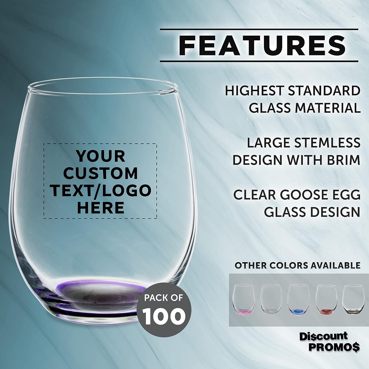Custom Stemless Wine Glasses in Bulk by ARC Perfection, 15 oz, 100 pack, Personalized Text, Logo, Purple or White Wine Glass Set, Purple