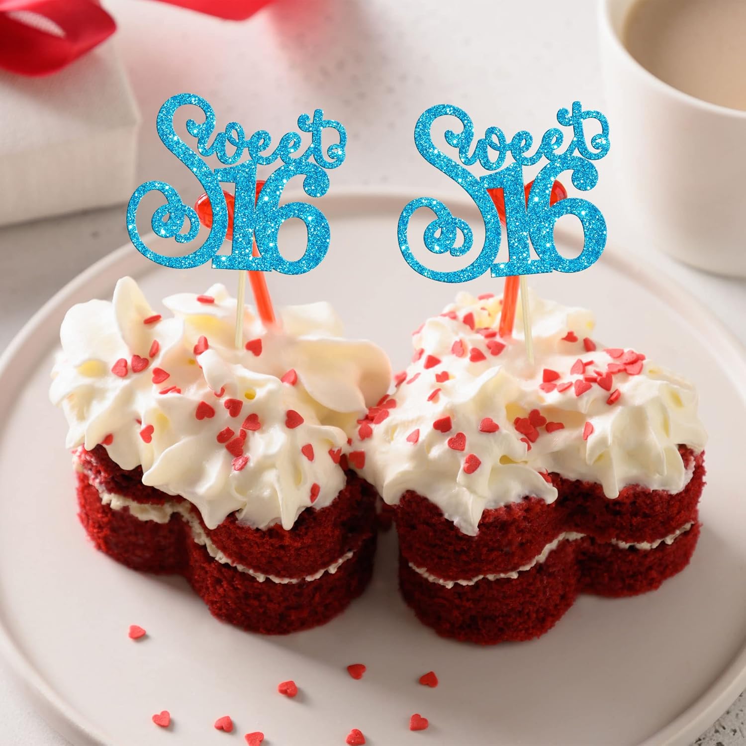 Gyufise 24 Pack 16th Birthday Cupcake Toppers Glitter Sixteen Happy Sweet 16 Cupcake Picks Cheers to 16 Years Old Cupcake Decorations for 16th Birthday Anniversary Party Supplies Light Blue