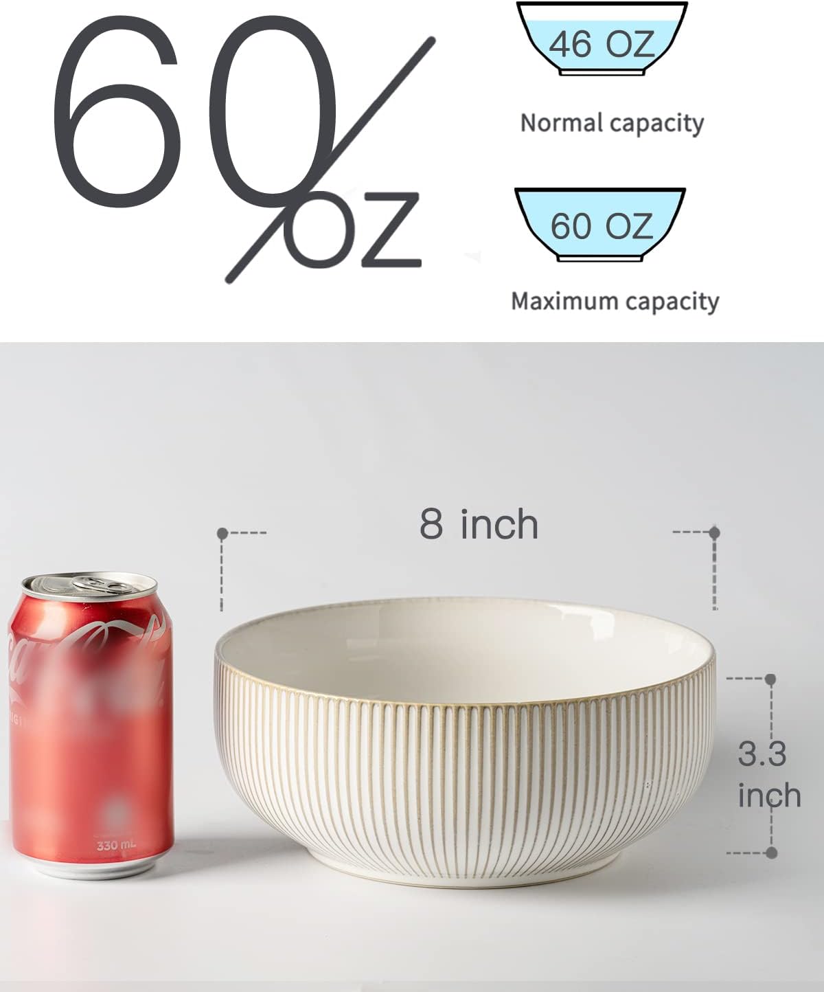 - 【Large Capacity & Size】With a generous 60 oz capacity, each of these large serving bowls measures 8 inches in width, allowing ample room for presenting and sharing your favorite dishes in style, while also functioning as a large fruit bowl or popcorn bowl