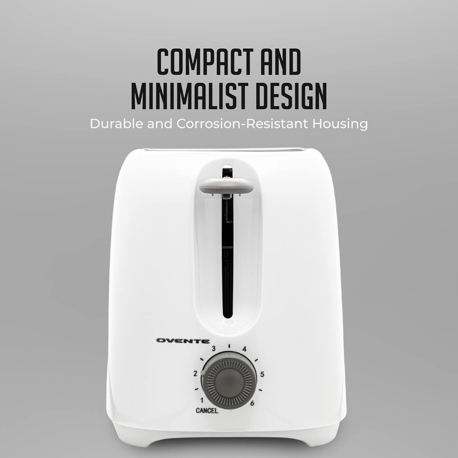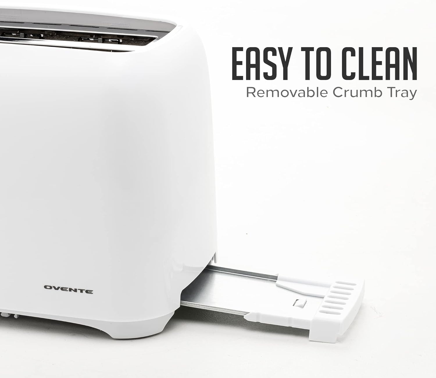 OVENTE Electric 2 Slice Toaster Machine with 6-Shade Browning Selector Setting, Compact Design and Removable Crumb Tray, 700W Power Perfect for Toasting Bread, Thin Bagels and Waffles, White TP2210WGY