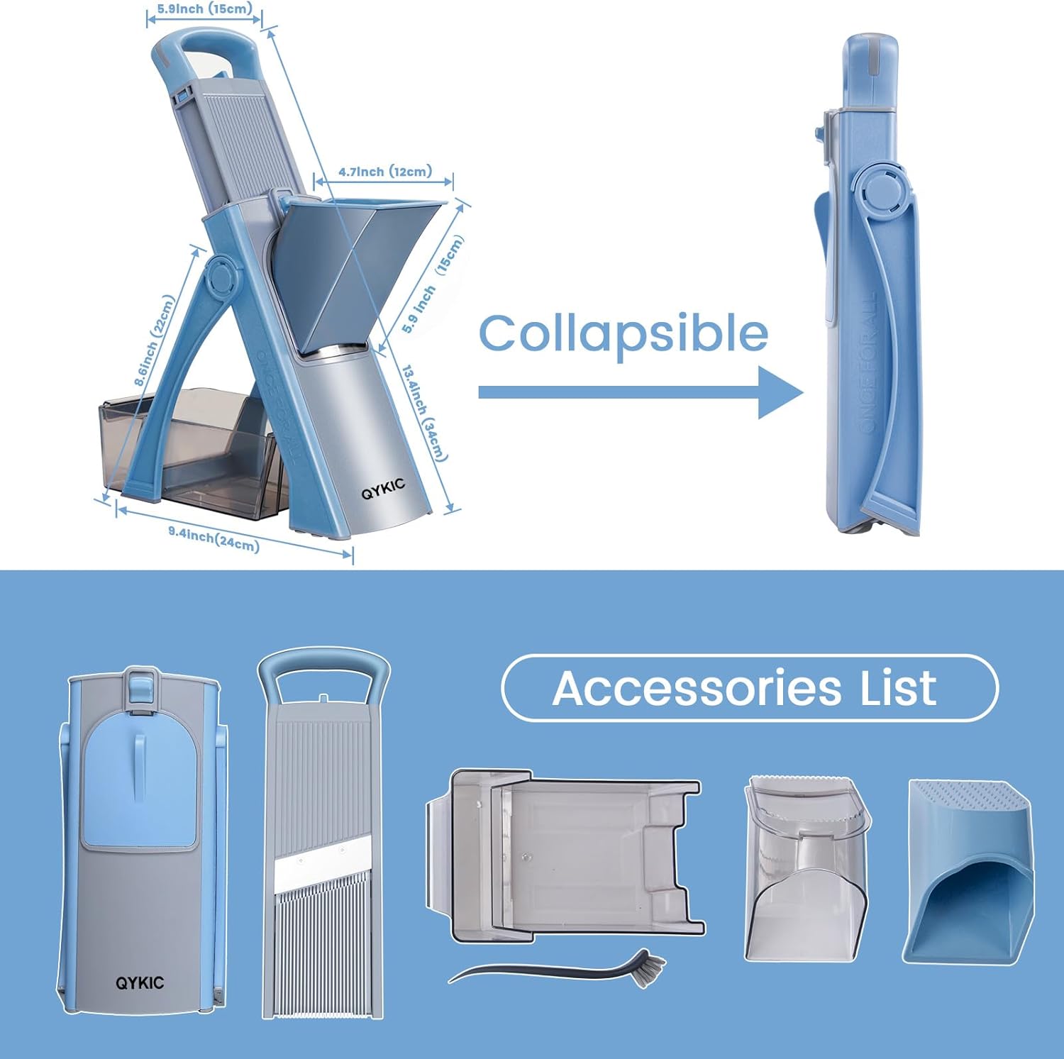 - ✅EASY TO CLEAN: This kitchen mandoline slicer is foldable and compact in design, size 14 *5 *11.5 inch,taking up little cabinet space than potato slicer, included brush can easily remove buildup on the blade,and the food catch container keeps countertops clean. It's the perfect thanksgiving christmas halloween gift.