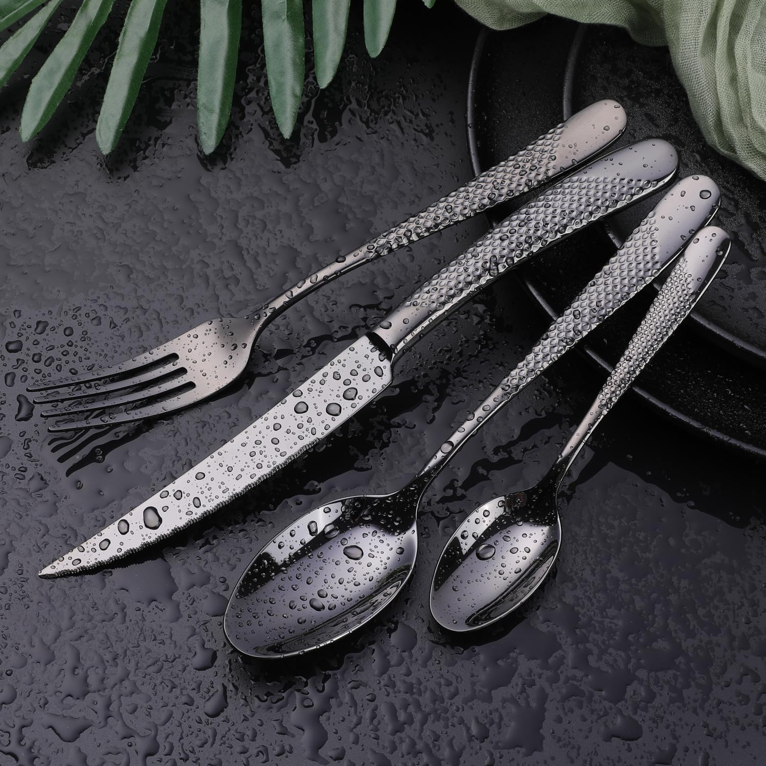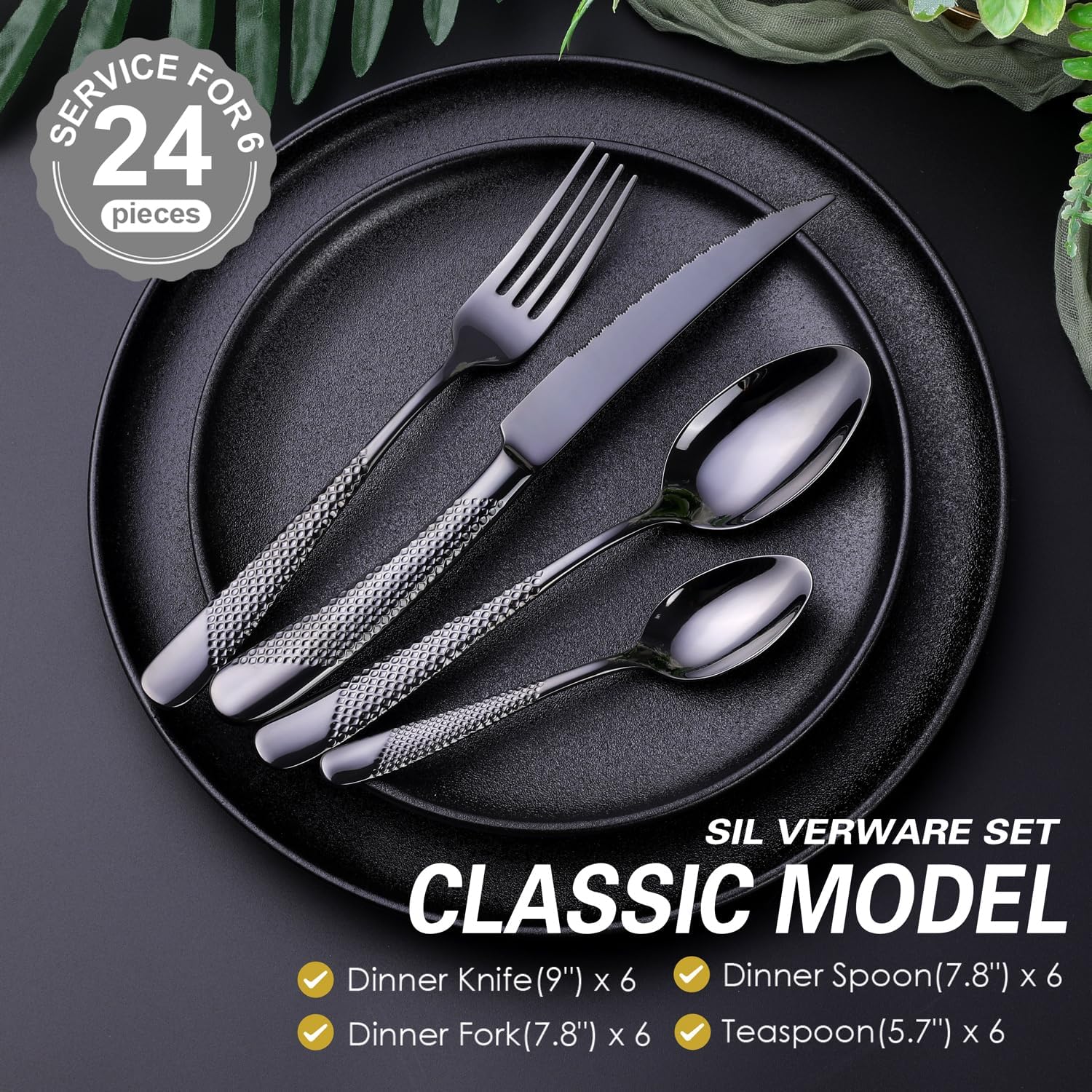 - 【24 PIECES FLATWARE SET FOR 6】: This hammered black silverware set comes with 6 Dinner Forks, 6 Ultra-sharp 2-in-1 Serrated Knives, 6 Dinner Spoons and 6 Tea Spoons, ideal for home, kitchen or restaurant use.