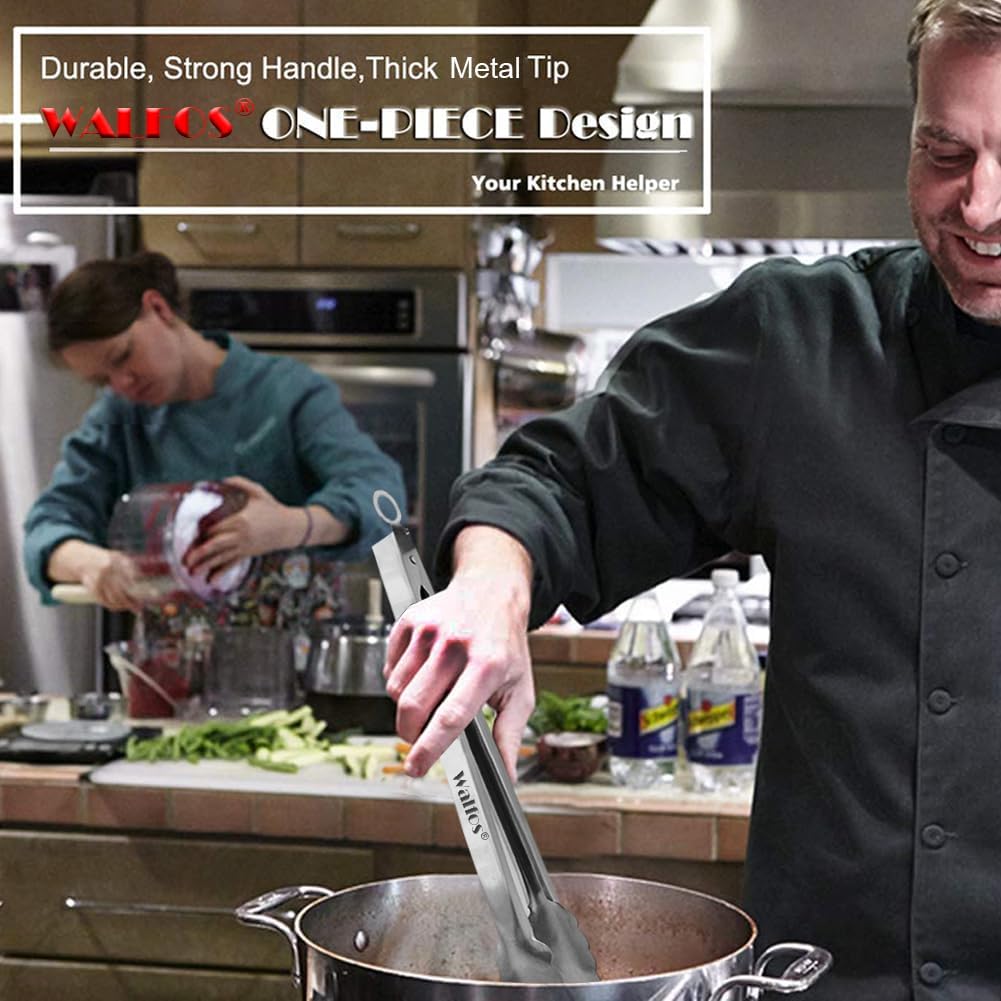 - FOOD GRADE AND STURDY STAINLESS STEEL- WALFOS Metal Kitchen Tongs are made from food grade Stainless Steel , food grade approved, anti-rust,light weight.Cooking tongs are made from a thick,1mm corrosion resistant food grade stainless steel for unbeatable strength and premium construction.Safe to touch food directly,good for health.