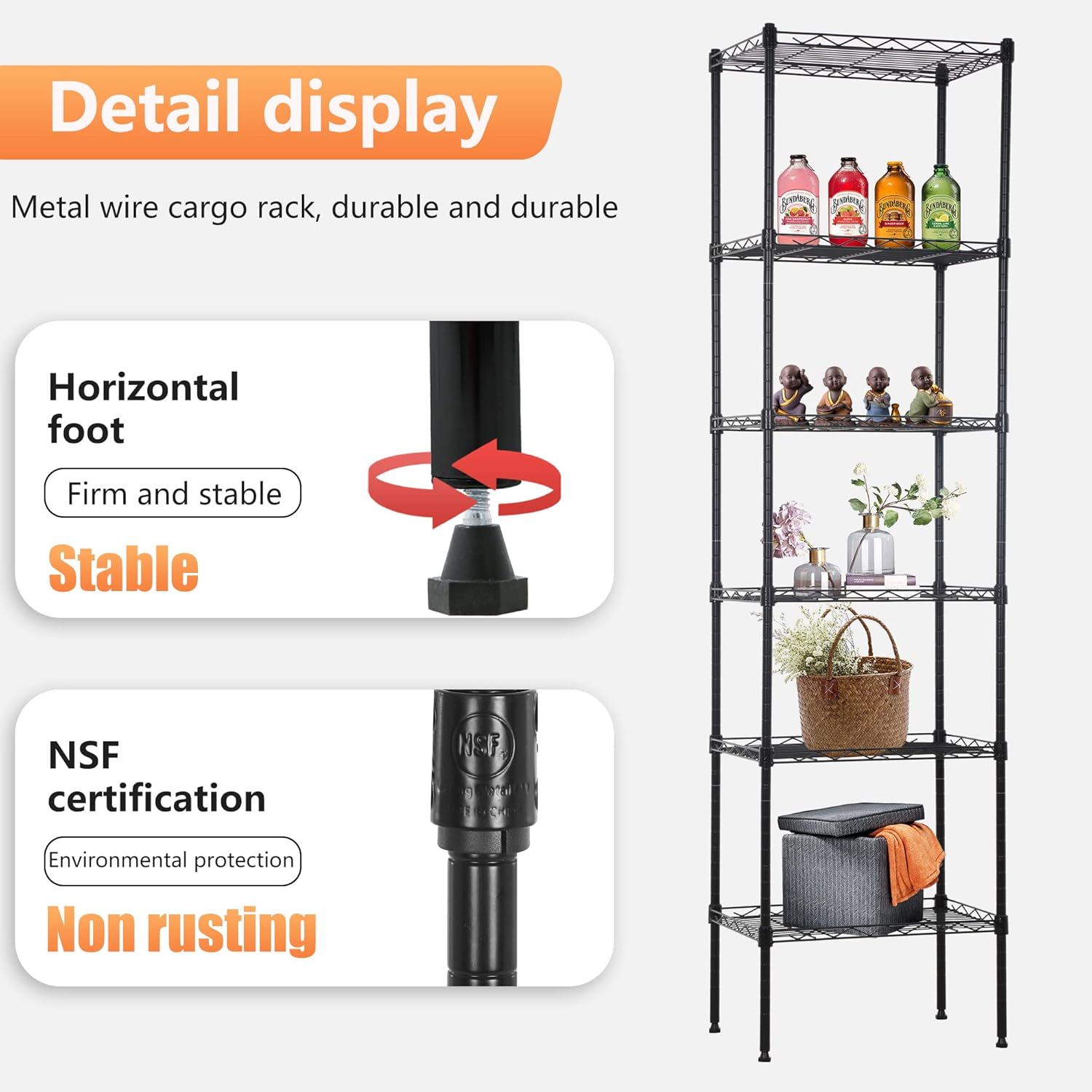 - Adjustable: You can adjust the height of the storage rack according to the size of the item. The spacing between each layer of this wire frame can be adjusted. The adjustable leveling feet of the frame allow the wire frame to be placed on uneven ground - it can be stabilized with just a simple twist.