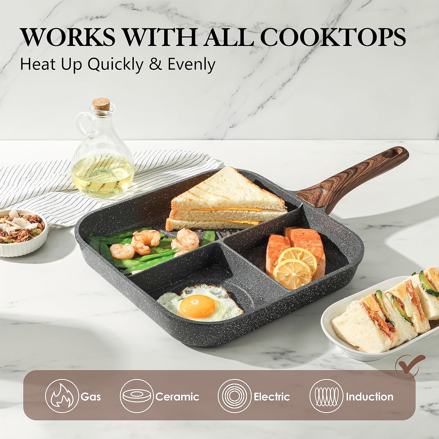 Sensarte Nonstick 11-Inch Square Grill Pan, 3-Section Versatile Breakfast Skillet, Die-cast Aluminum, PFOA, PFOS, APEO Free, Induction, Gas, Electric, Glass, Ceramic