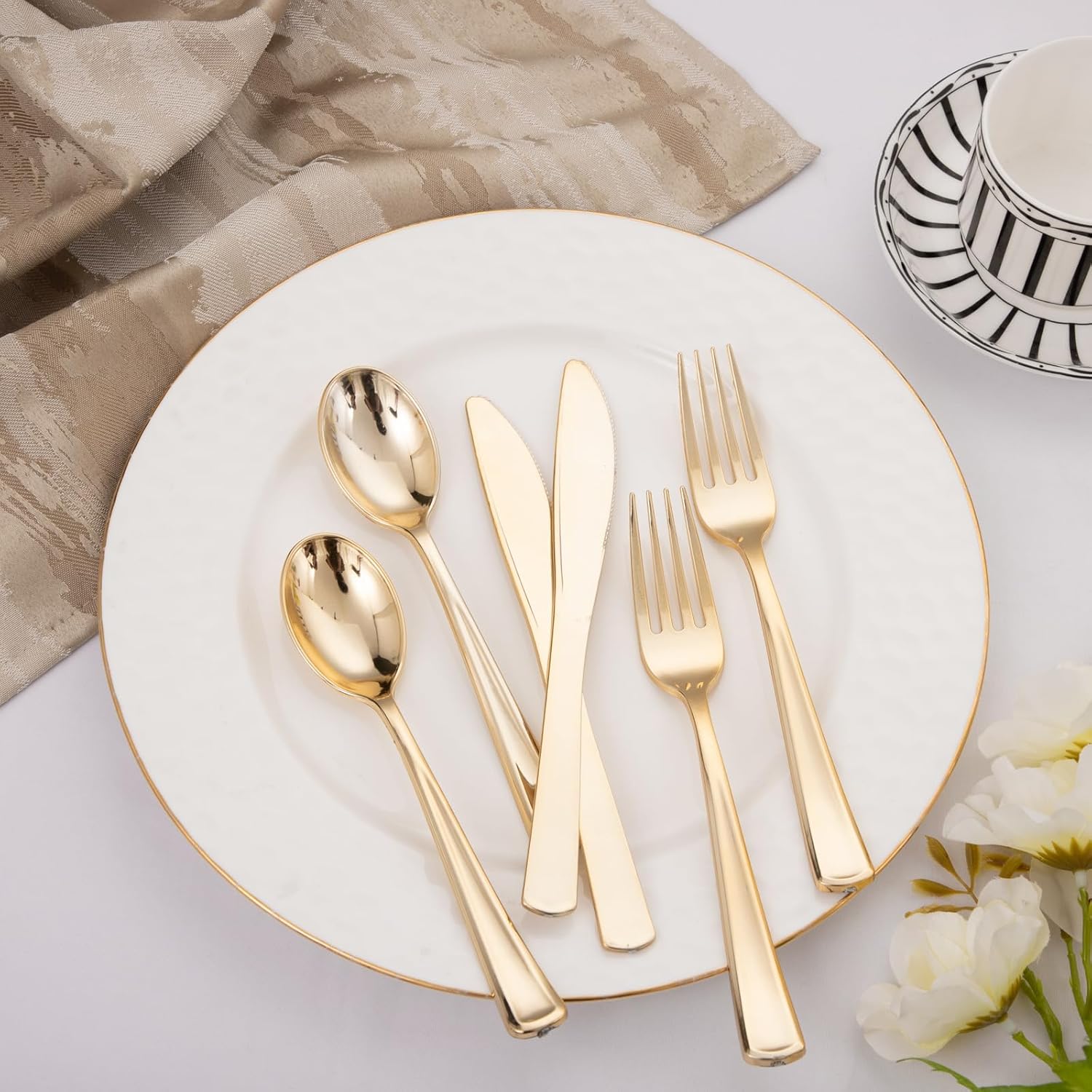 - ELEGANT DESIGN - Gold plastic silverware will stand out more than any white or clear plastic cutlery set that looks like real metal cutlery. Elevate your table with stunning disposable plastic cutlery that will complement any party theme. You can feel the quality of the gold plastic cutlery by the weight of it in your hand.
