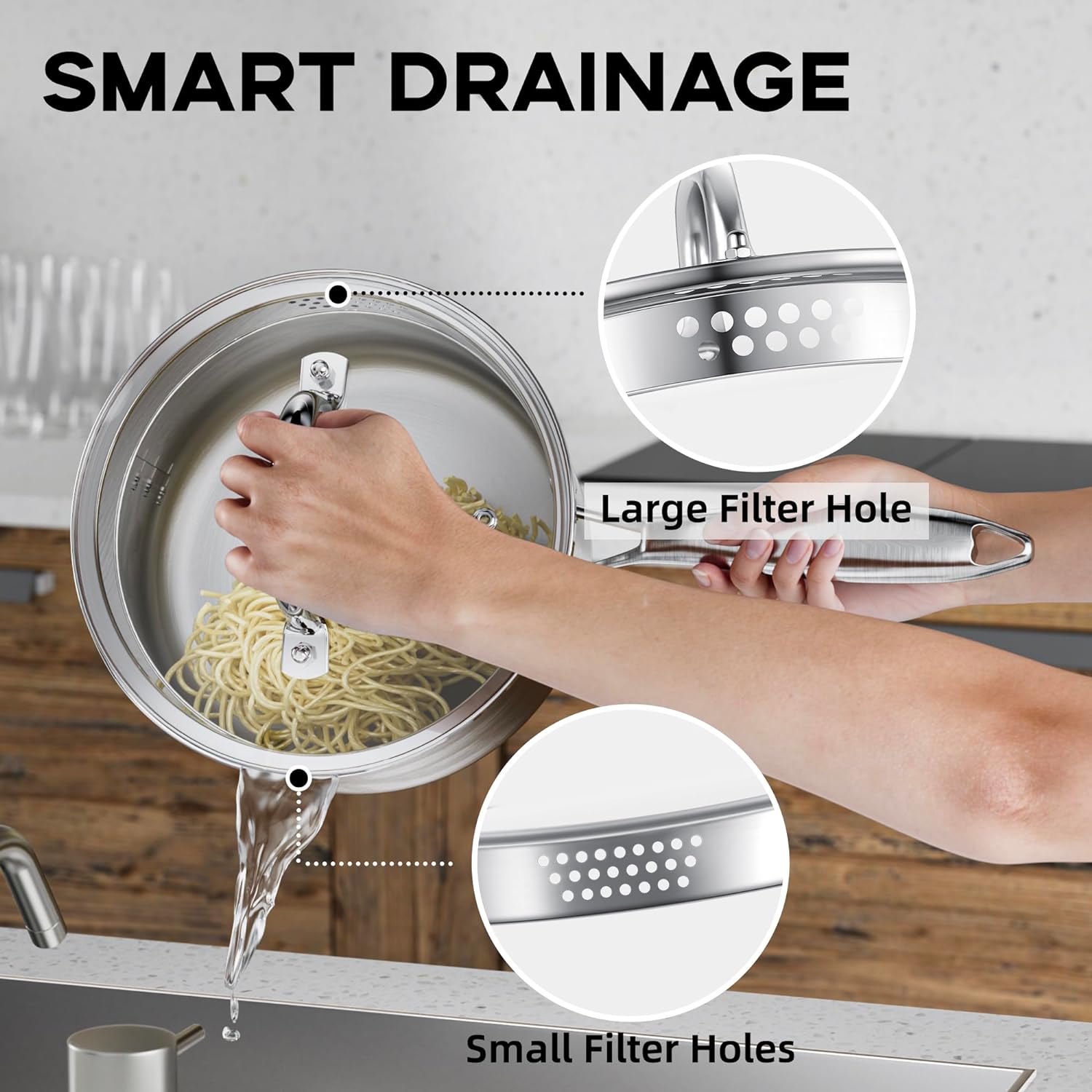 - Efficient Drainage System: Equipped with a large drainage hole on one side and a small drainage hole on the lid, our saucepan allows for easy and precise pouring, giving you control over the amount of liquid you want to drain
