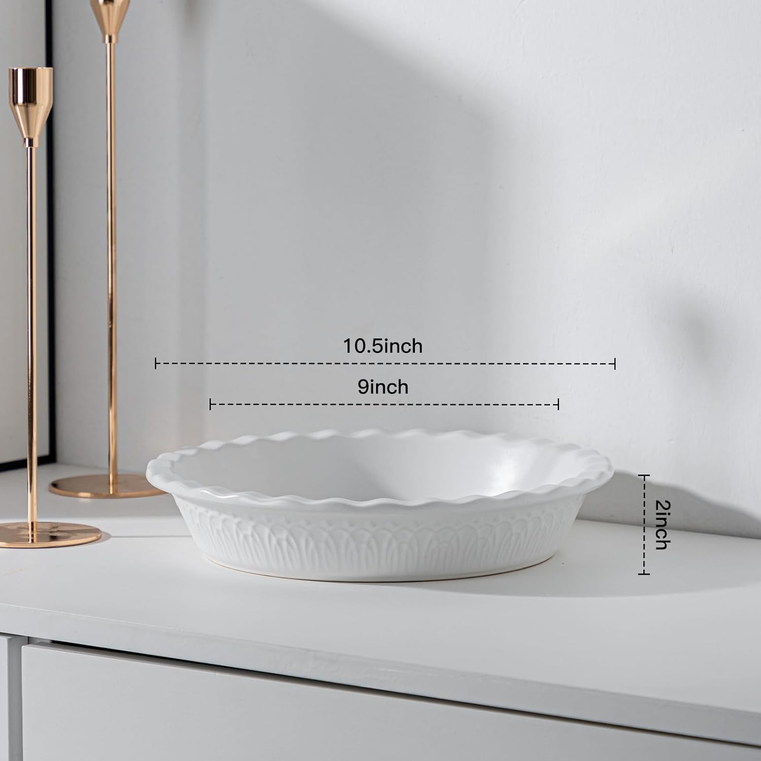 - Ruffled Edge Pie Plate: 10.5 inch in upper diameter, 2 inch in height, it fits any standard pie recipe. Whether you’re making an apple pie or Lorraine, the fluted rim makes it easy to crimp down the pie dough for a lovely crust. The fluted rims are aesthetics and easy griping.