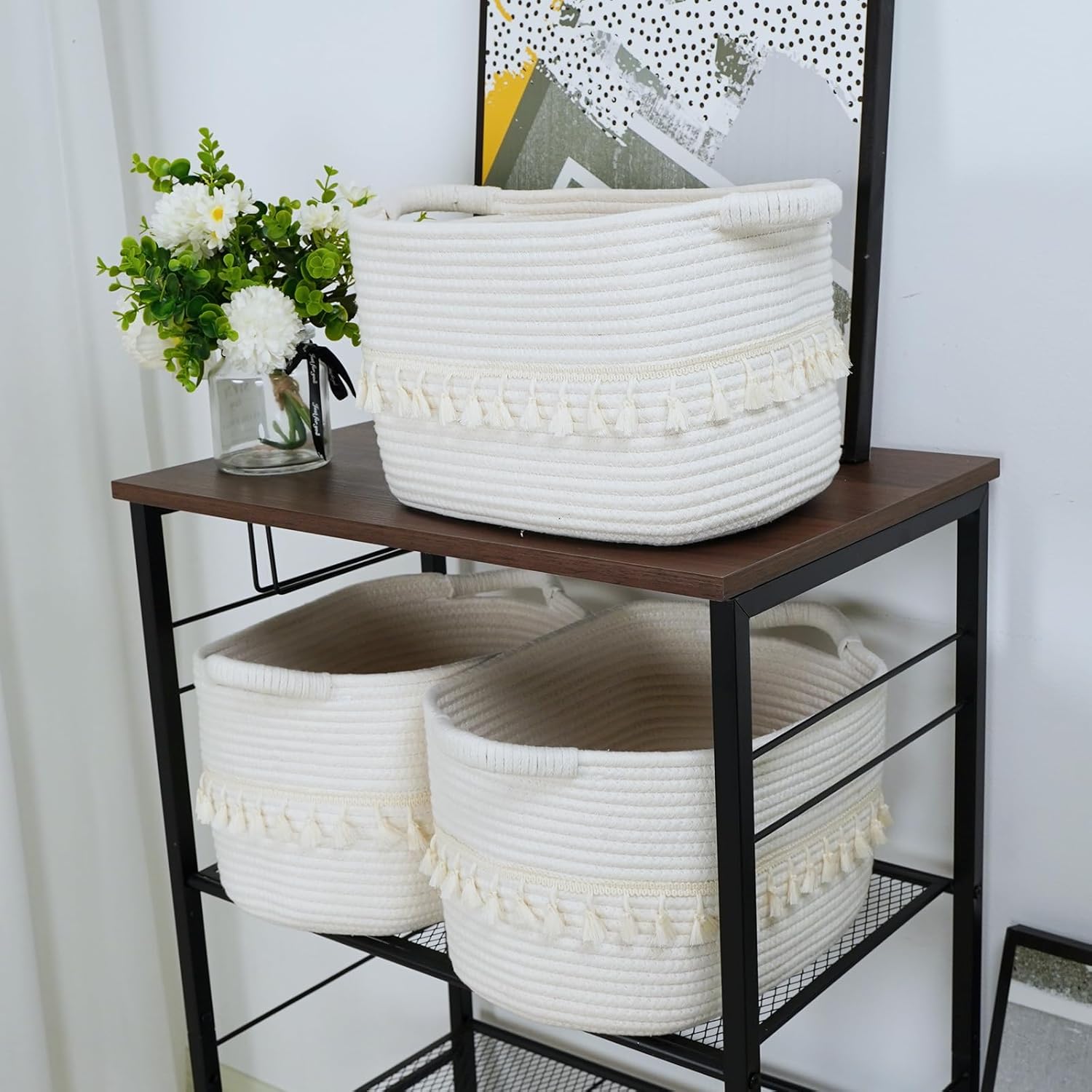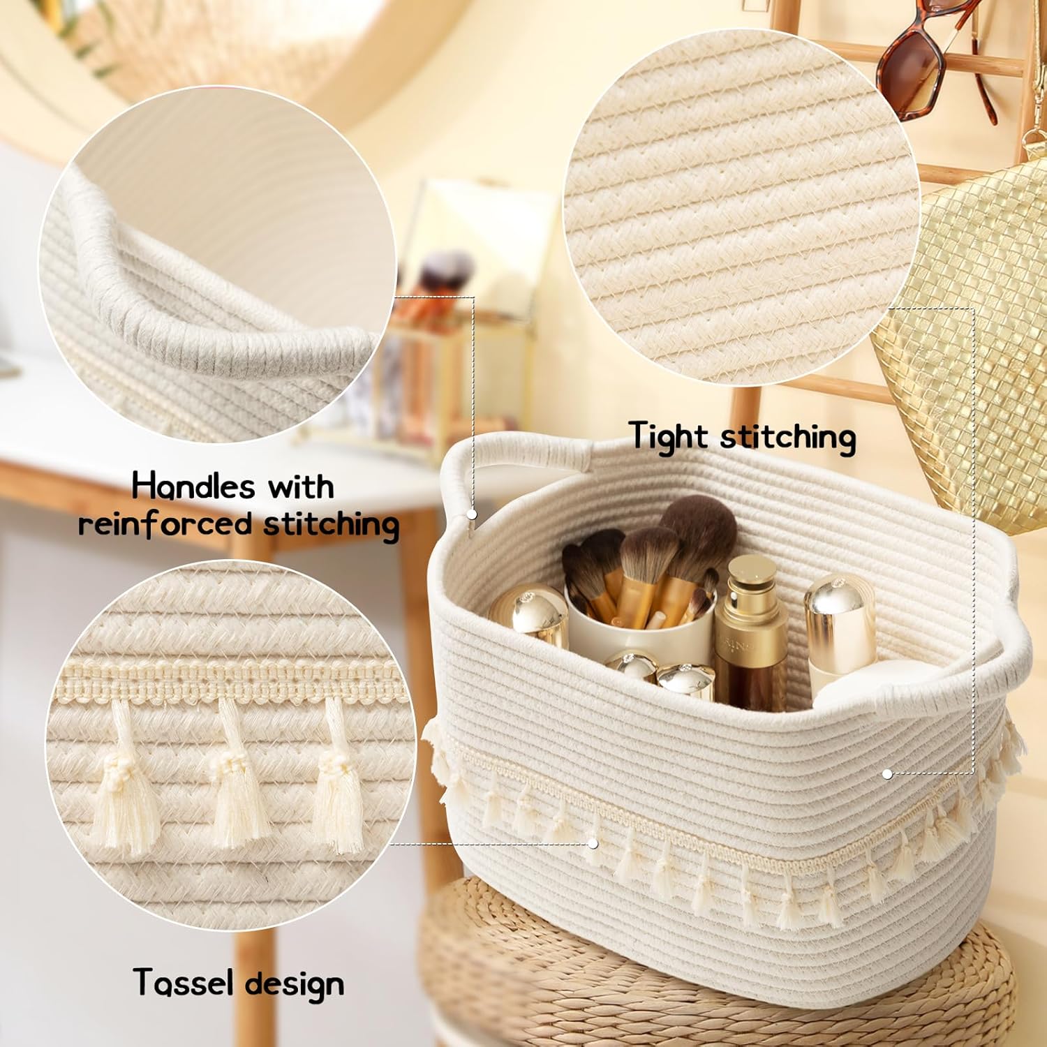 - Solid and durable: Our boho storage baskets feature sturdy handles that make them easy to move around. Rope baskets stand the rigors of daily use. Thanks to a flexible and resilient cotton material, they can bounce back into shape after being folded