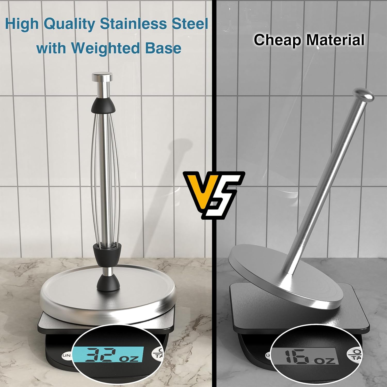 - STUDY WEIGHTED BASE WITH NON-SLIP PAD:With weighted base to make sure that countertop paper towel holder won't shake when you tearing the paper. Non-slip EV pad at the bottom, won't scratch your desktop. Outstanding kitchen decor and accessories!
