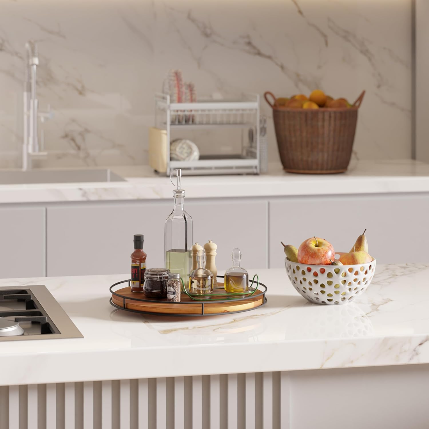 - Versatile and Spacious: With its expansive 16-inch diameter, this lazy Susan offers abundant storage space. It easily accommodates a wide range of items, making it a versatile addition to your kitchen, dining area, or living room. Whether it's organizing spices, displaying decorative pieces, setting up a delightful afternoon tea or coffee spread, or arranging an appealing charcuterie board, this lazy Susan has you covered.