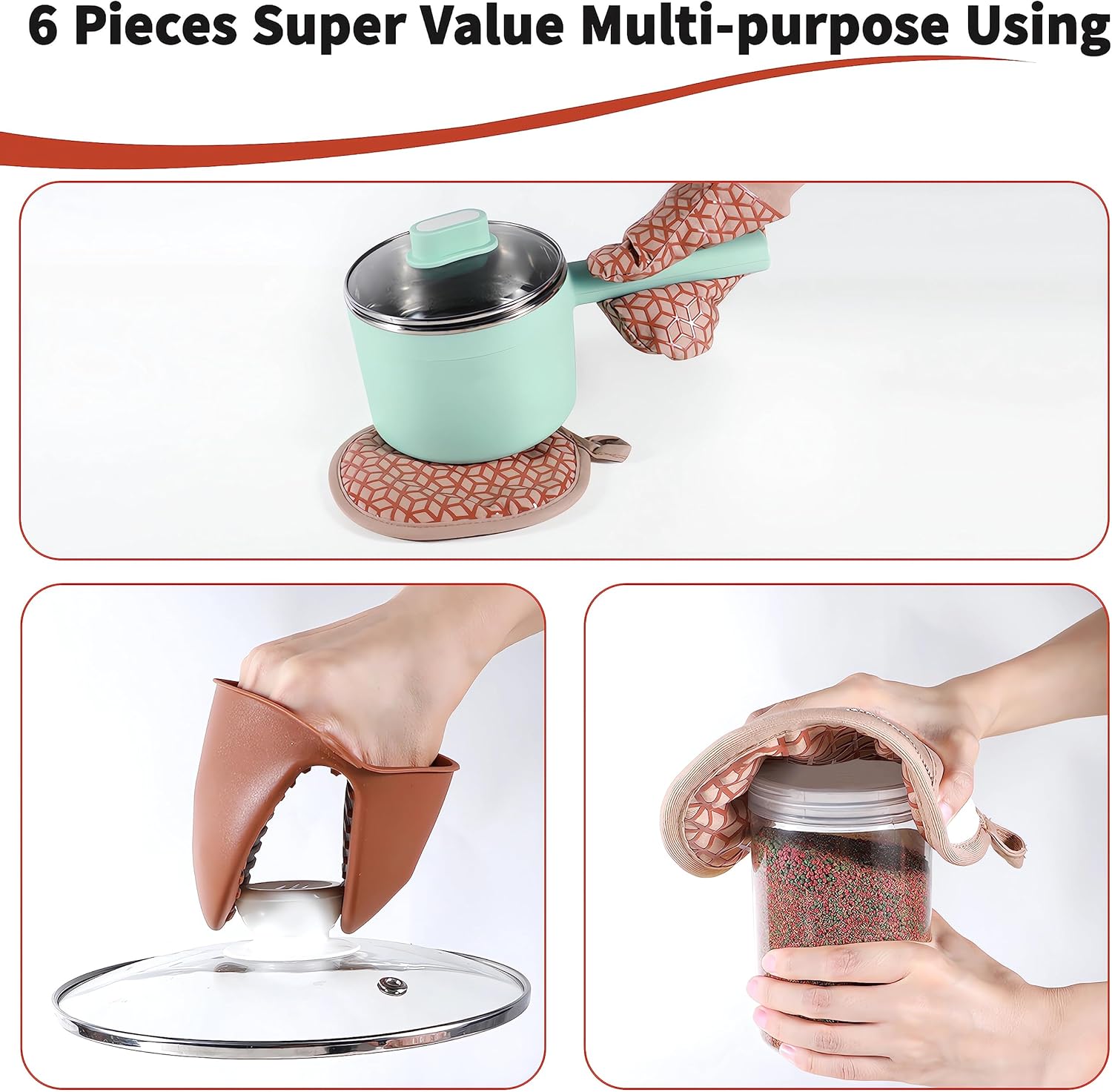 Oven Mitts And Pot Holders Set 6Pcs,Kitchen Oven Glove,High Heat Resistant 500°F Large Size Oven Mits And Potholders With Soft Cotton Lining And Non-Slip Silicone Surface For Cooking (Brown)