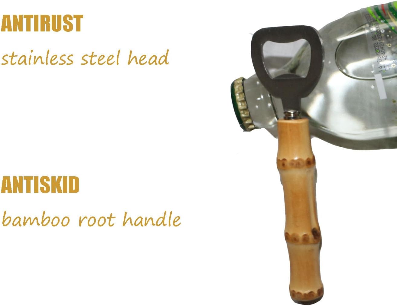 - 【Unique Design】This beer bottle opener set are made in natural smooth bamboo root handle and stainless steel head.