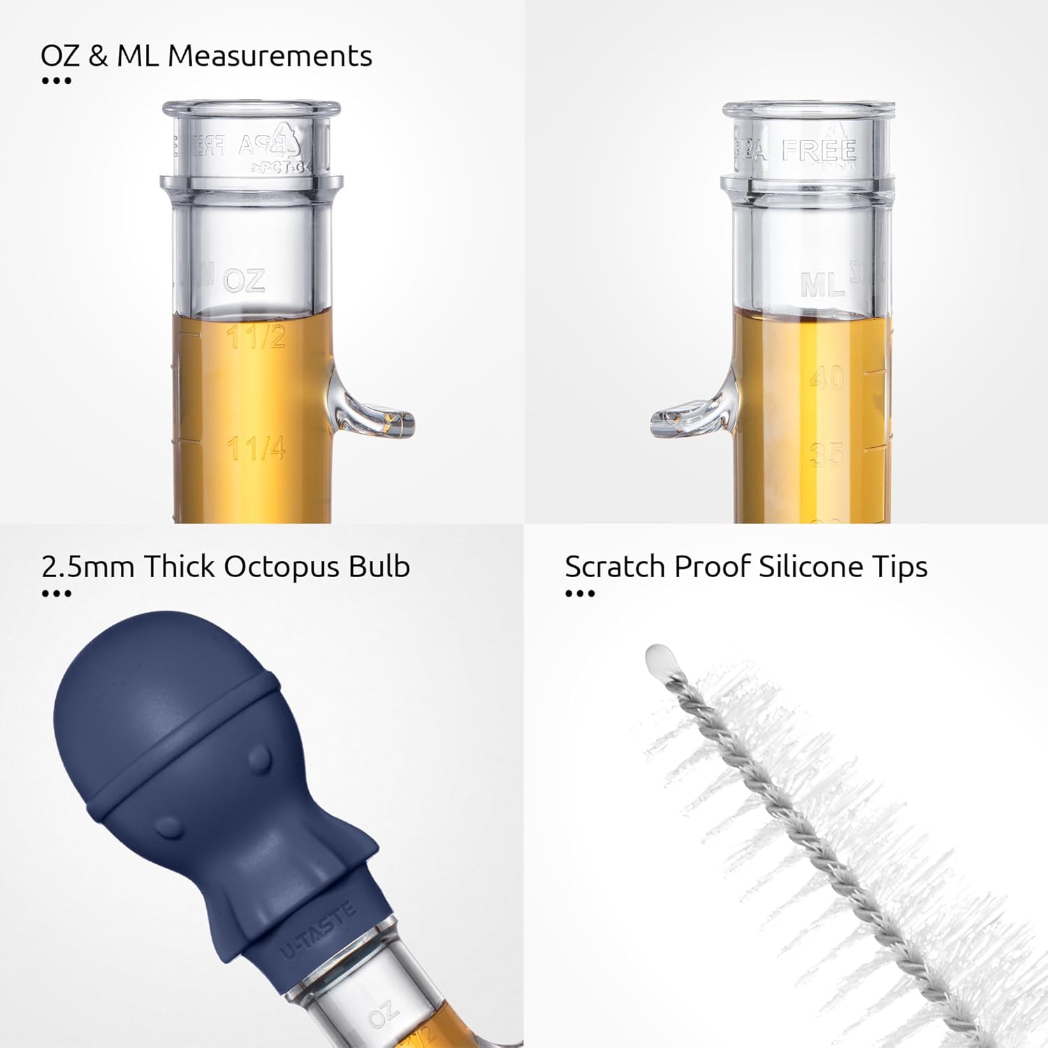 - [Heat Resistant Silicone and Tritan] U-Taste turkey baster is built to withstand hot juice. No melting issues. The cute octopus bulb is made of 600℉ heat resistant silicone and Food Grade food grade tritan body (Tritan is a temperature-resistant PCTG with a temperature resistance of -4~228.2℉). The clear-like-crystal texture lets you know what you are basting the food with. You can use it to baste turkey or ham, or to extract fat from baking meatloaf.