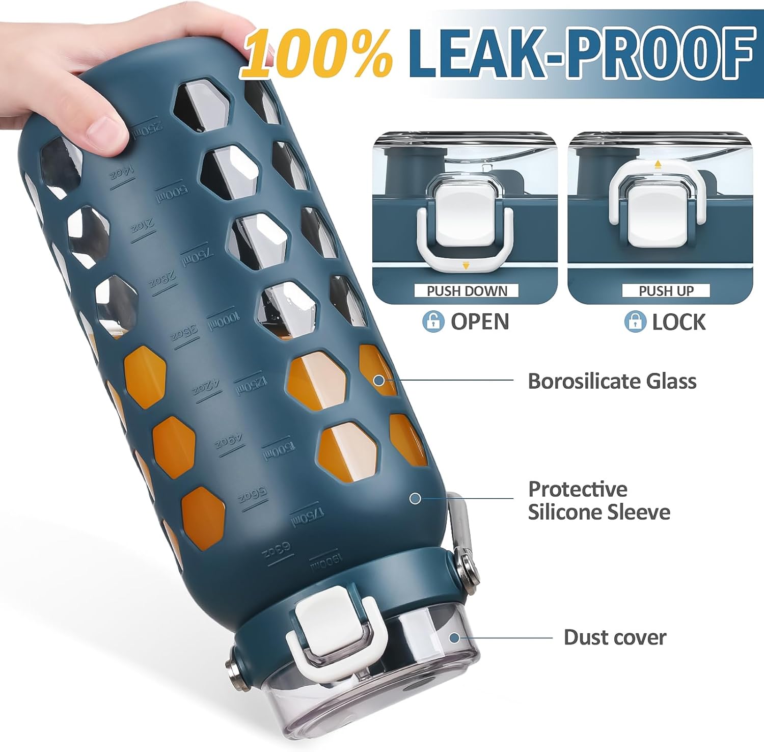 MUKOKO 64oz Glass Water Bottles with Straw and Lid,Half Gallon Water Bottle with Time Marker,Large Glass Water Jug with Silicone Sleeve and Stainless Steel Handle-Blue