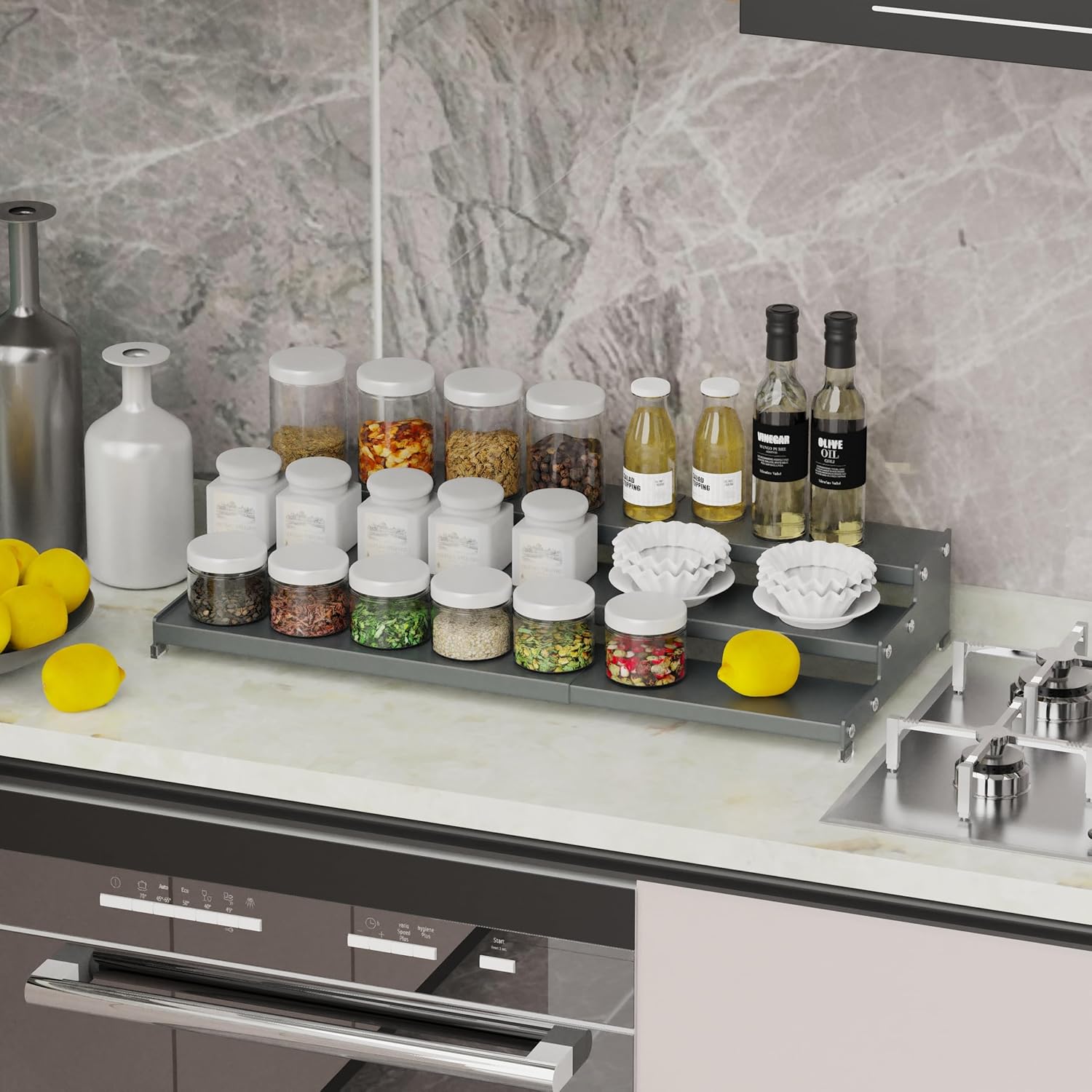 Expandable Spice Rack Storage organizer with 3-Tier step shelf cabinet,seasoning racks organizion.Great for Kitchen countertop shelves,Bathroom,dressing table,Cupboard,Pantry and more(1pack/Gun-gray)