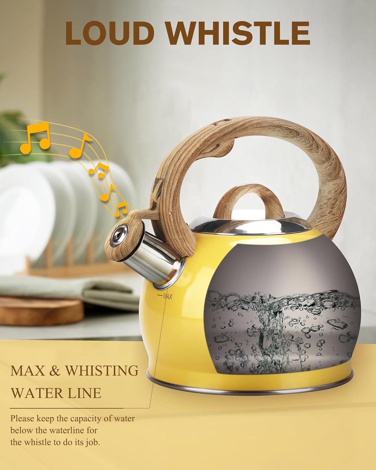 - Loud Whistle: When you are simultaneously focused on other issues (such as chores or games), the whistling tea kettle will alert you with a loud whistle after boiling water, effectively reducing safety hazards and preventing boiling. Note: The kettle will sound when the water is boiling as long as it is filled to 80% of its capacity