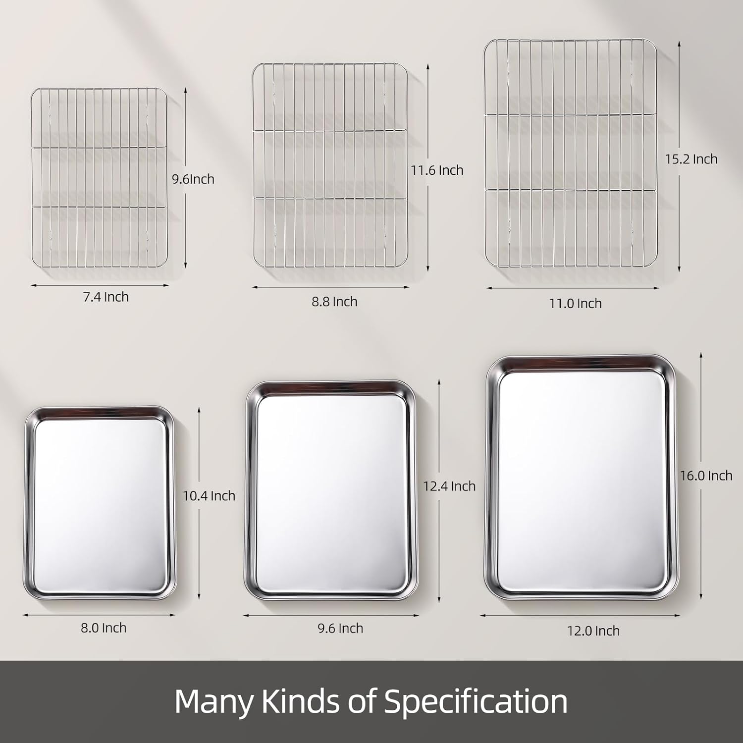 - MULTI-SPECIFICATION:This baking sheets set comes in 3 different sizes, including small 10.4x8.0 inches, medium 12.4x9.6 inches, and large 16x12 inches, and each cookie sheet comes with an appropriately sized baking rack.