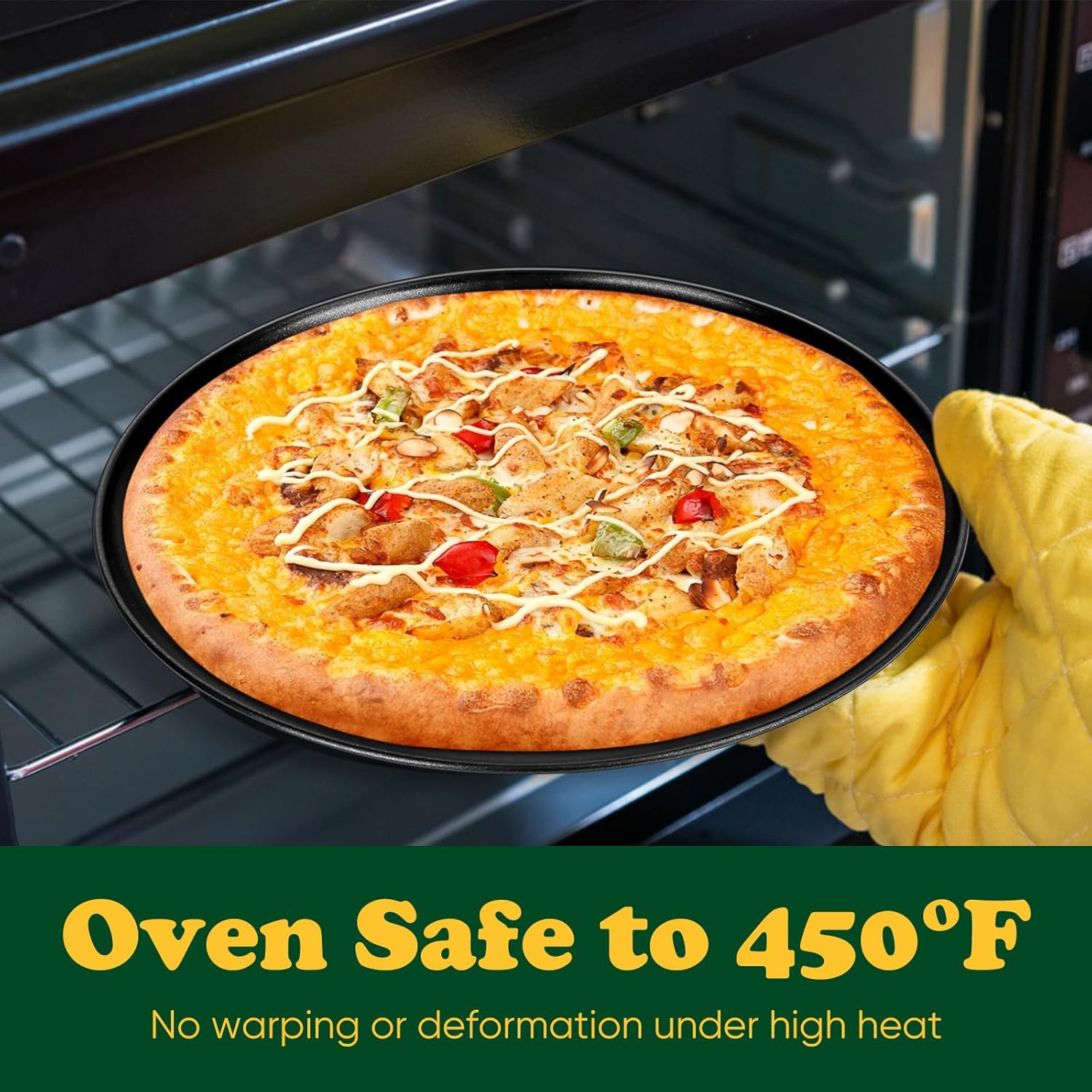 - CRAFTED - Smooth rolled rims with no sharp edges, Provides you with comfortable grasp, Slightly sloped sides for holding more toppings without messing your oven, Premium steel heats evenly with no hot spots producing perfect crispy crust
