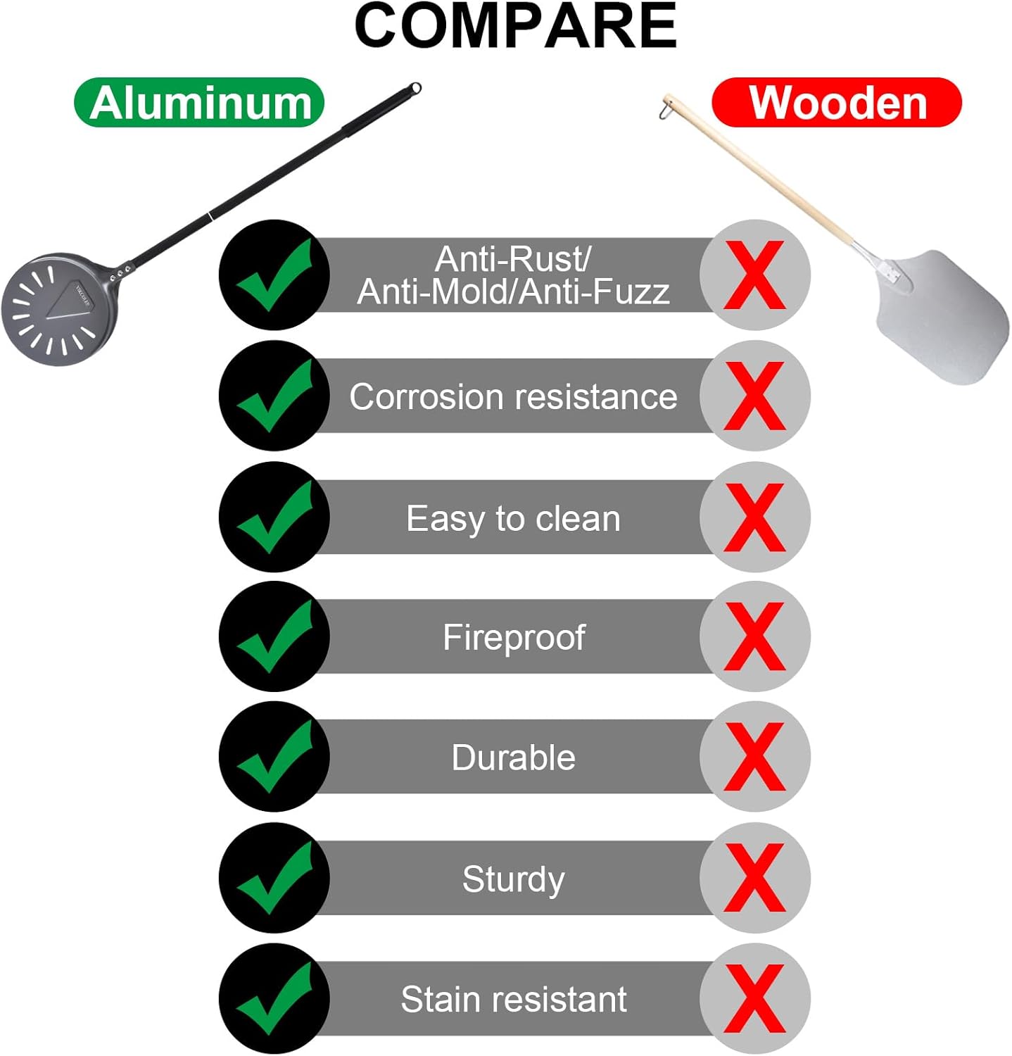 - LIGHTWEIGHT, STURDY, AND LONG-LASTING: Crafted from hard anodized aluminum with a sandblasted finish, this pizza turning peel is made from commercial-grade material that is resistant to corrosion. Its durability guarantees years of reliable use, providing you with the confidence to rely on it time and time again.
