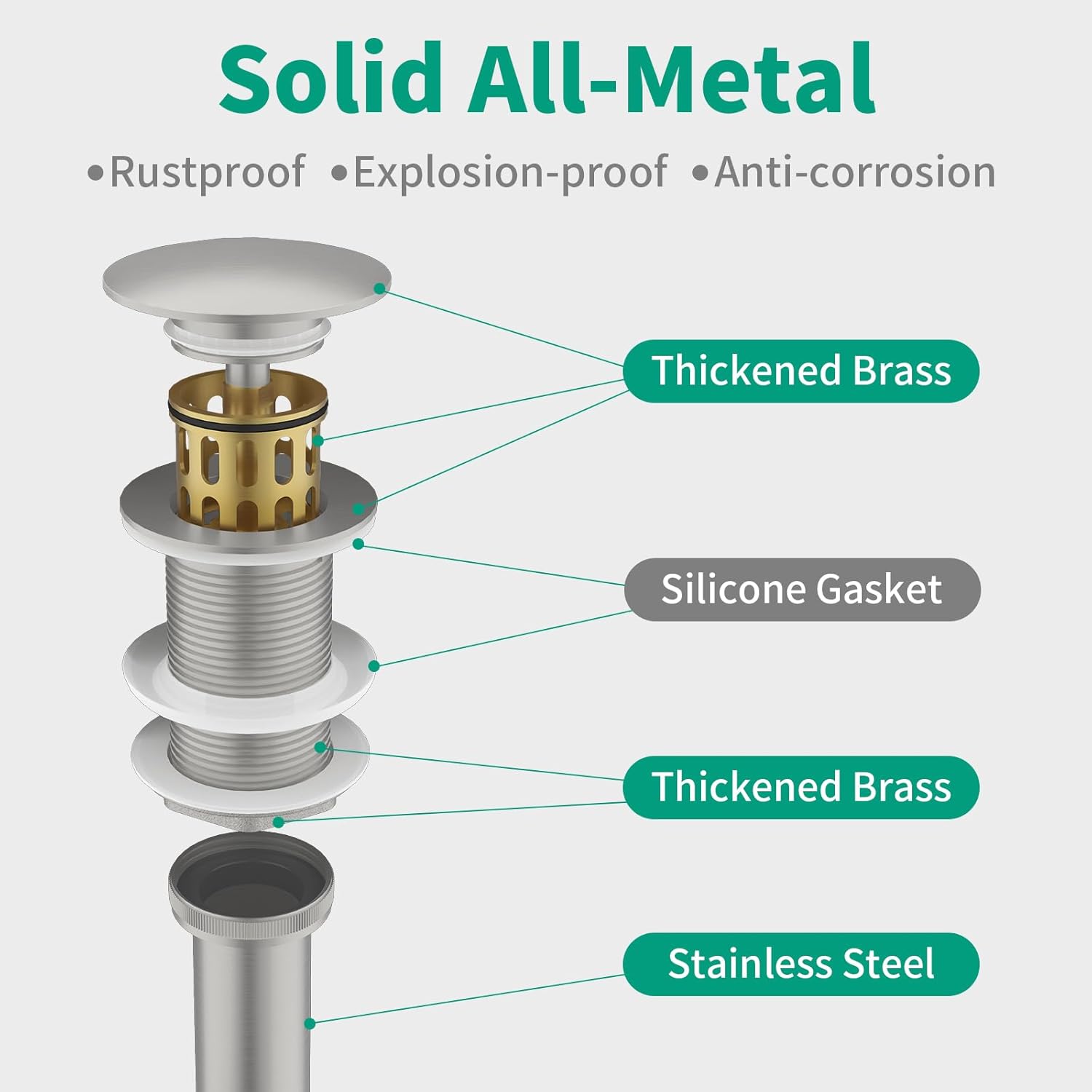 - 【Leak-proof Design】: This push button sink drain is equipped with two thickened silicone gaskets and a brass locking nut, which can ensure a tight fit between the drain and the sink. Moreover, the silicone gasket has the characteristics of resistant to oxidation and wear, which can effectively preventing water leakage and thus keeping the bottom of the sink dry.