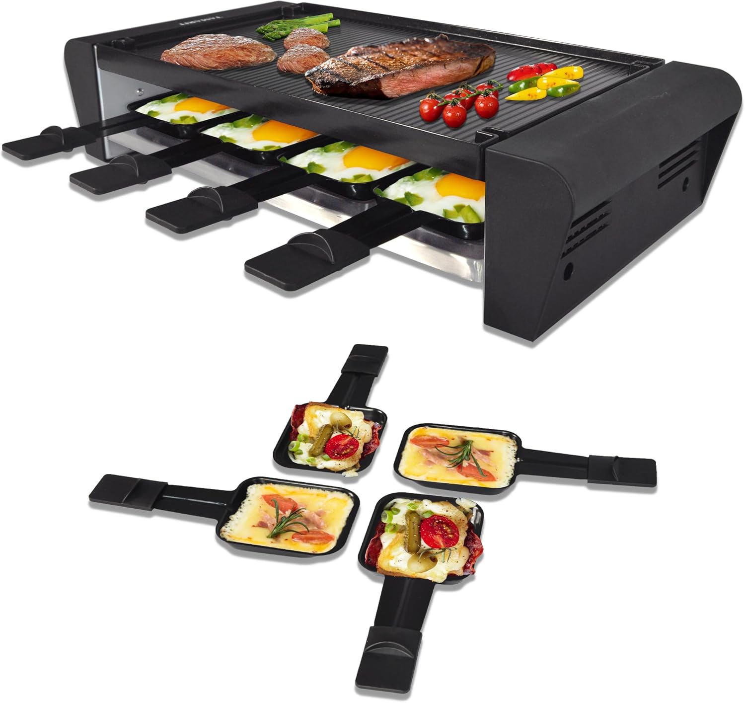 - High Power And Multi-Function:Raclette table grill for 4-8 person, 18.5*8.9*4.2 inches. 1300 W, 120V, 60 Hz. Can melt cheese, cook up meats, steak, hamburgers, pizza, seafood, veggies and more quickly. Includes 8 pcs cheese melting pans and spatulas, suitable for 4-8 person, everyone can make and enjoy tasty bites according to their different needs. Raclette grill stone, is a must-have cooking or grilliing helper for home kitchen