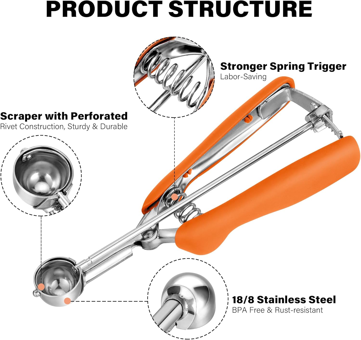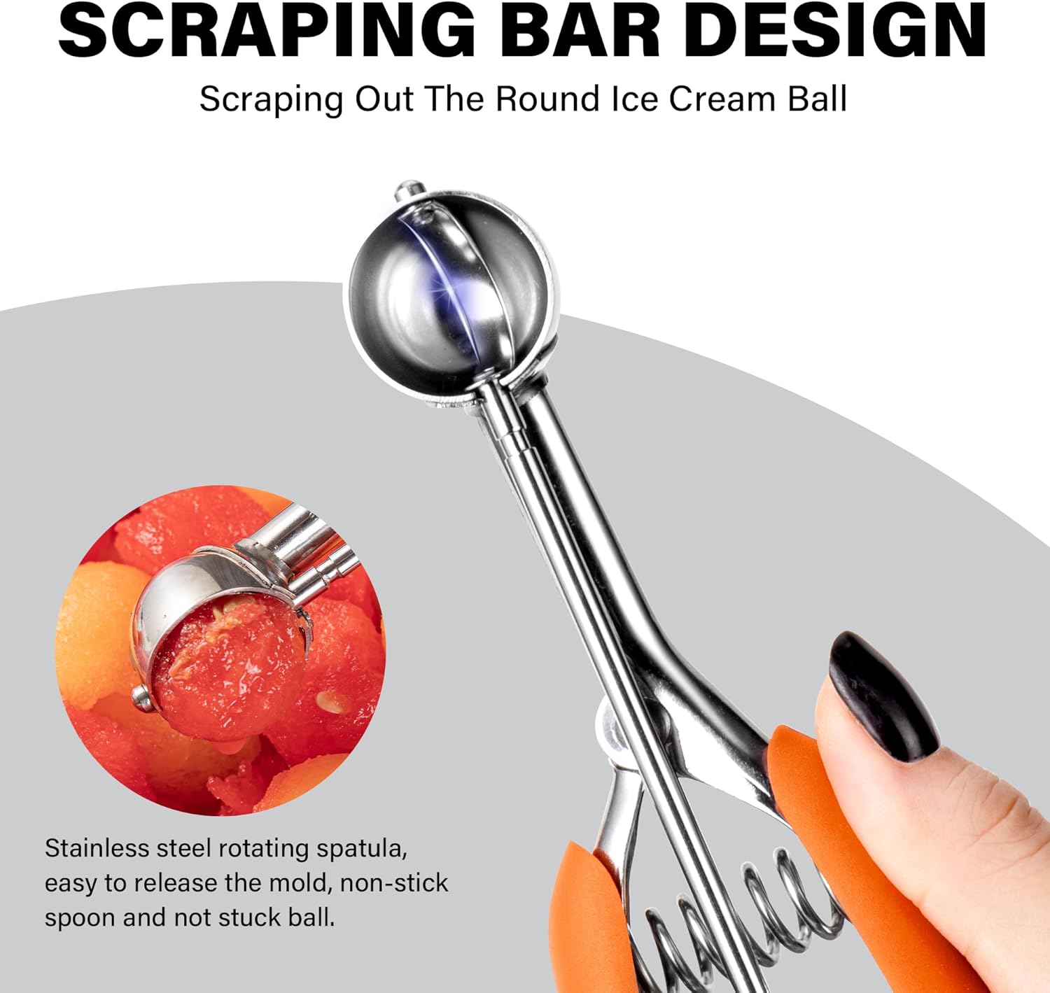 - 🍨【Looking for New Kitchen Gadgets?】 Here's a effortless scoop you won't want to miss! Featuring an innovative gear ratchet release system, the ice cream scoop with Trigger Release is perfect for taking the pressure off your wrist and hand when in use, it makes scooping food a breeze! The handle fits your hands comfortably, just squeeze the handle gently and the scoop scraper bar can quickly releases the food neatly.