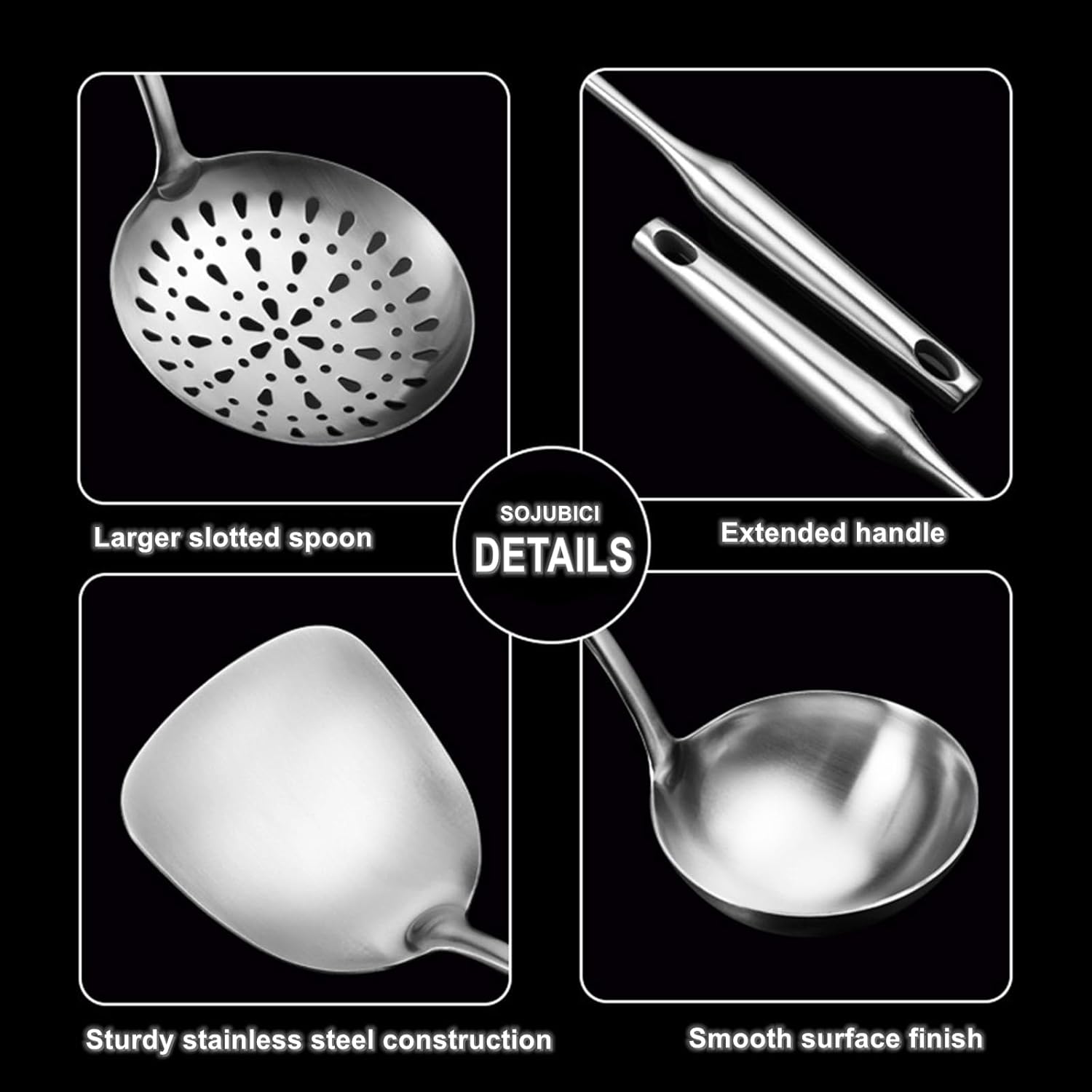 - 🌿Versatile 6-Piece Set: This kitchen utensil set comprises six essential cooking tools, including a wok spatula, soup ladle, skimmer slotted spoon, spaghetti spoon, serving spoon, and slotted spatula turner. From stir-frying to serving, saucing to scooping, you'll have the perfect tool for every culinary task.
