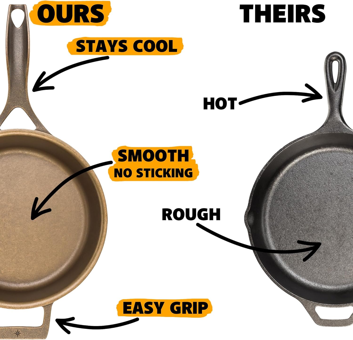 - HIGHLY ACCLAIMED: Our highly acclaimed, handmade cast iron cookware is built to last for generations. Crafted with no toxic chemicals or space-age materials, just pure iron. Renowned for our smooth surface finish and practical design, these skillets offer durability that stands the test of time.