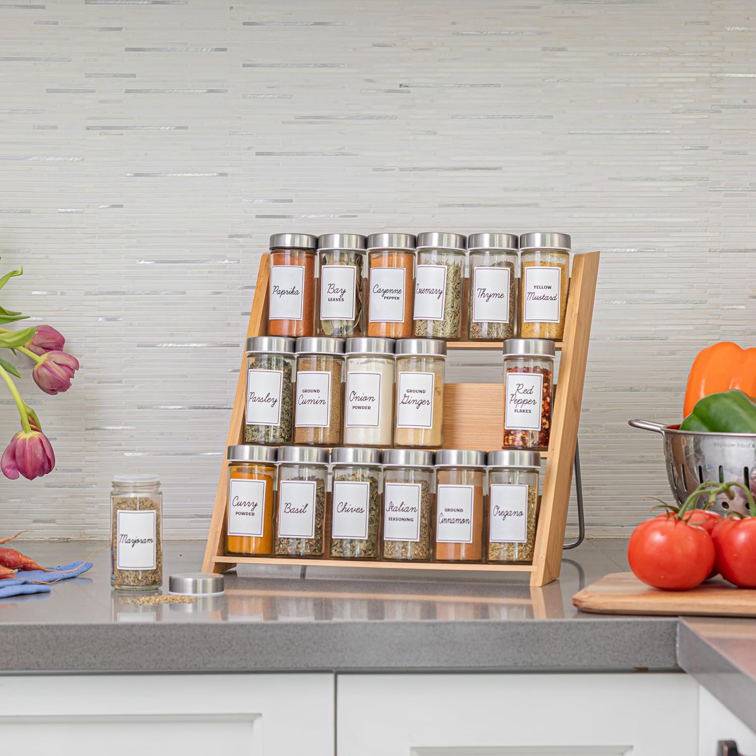 - SPICE JARS: Comes with 18 glass jars that are sturdy and easy to clean. The jars have stainless steel lids and inner shaker tops for easy dispensing of spices.