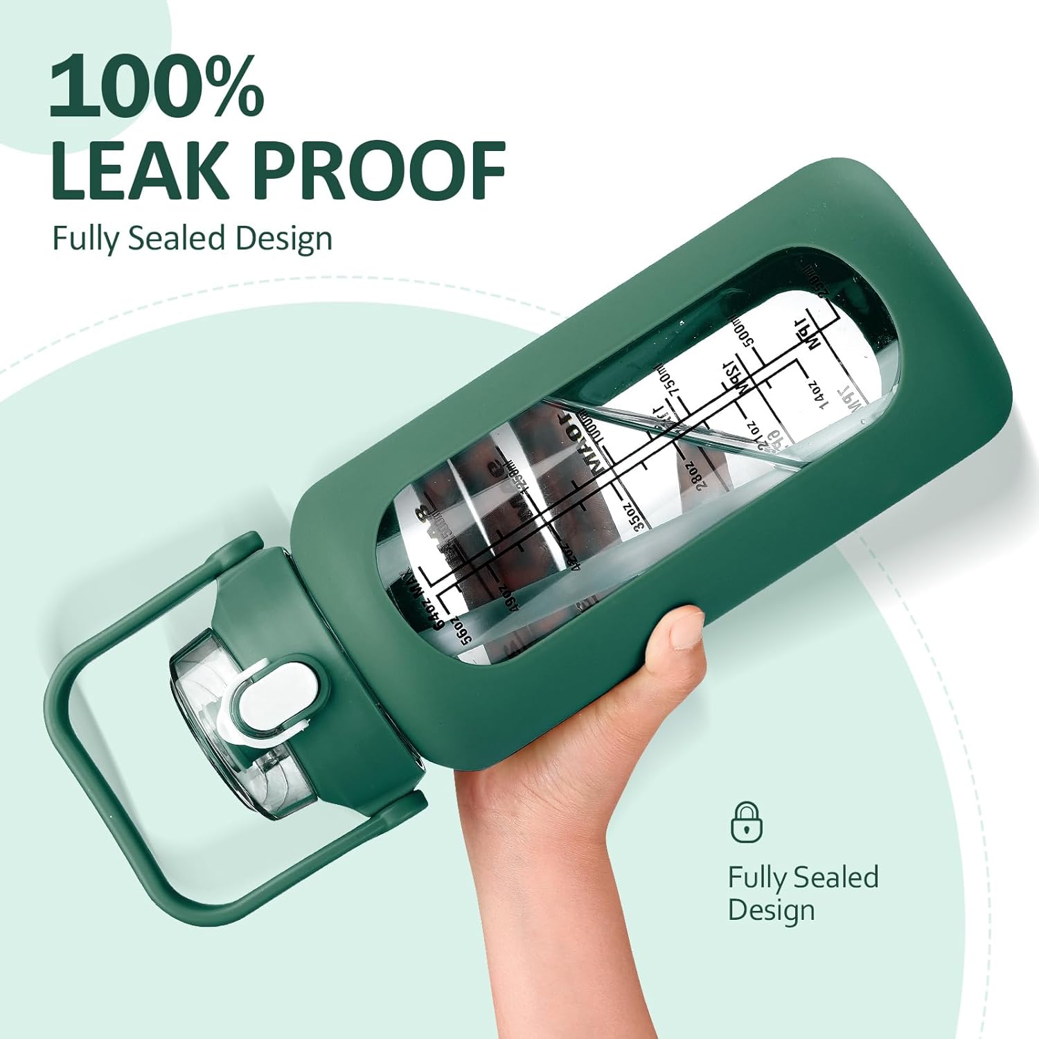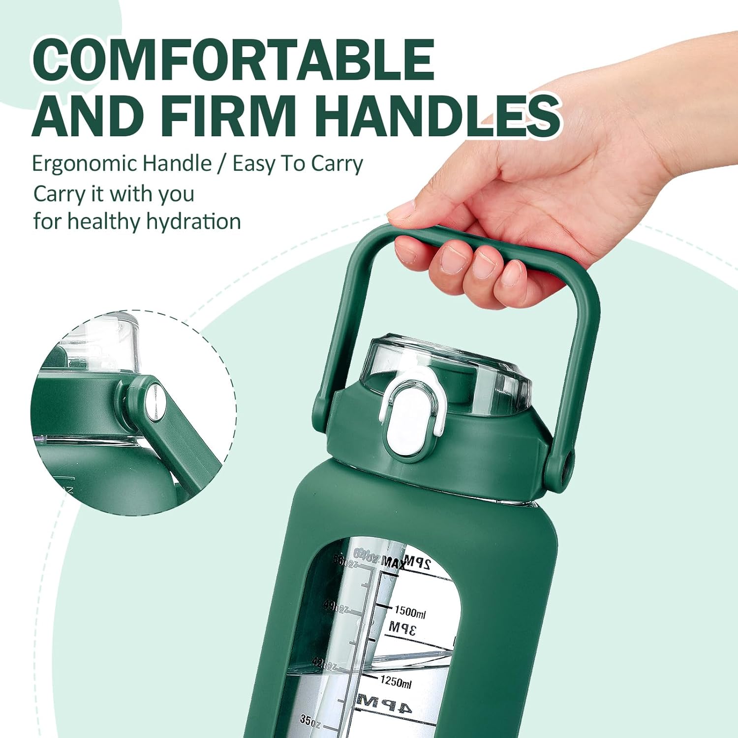 - ❤More Function- Our glass water bottle with stylish silicone sleeve which provides more grip and prevents the water bottle from slipping out. -This large motivational water bottle has a wide mouth, not only easy to hold ice cubes and fruit but also very easy to clean, you can use our complimentary cup brush to clean your water glass. -Handle on the lid for easy portability.