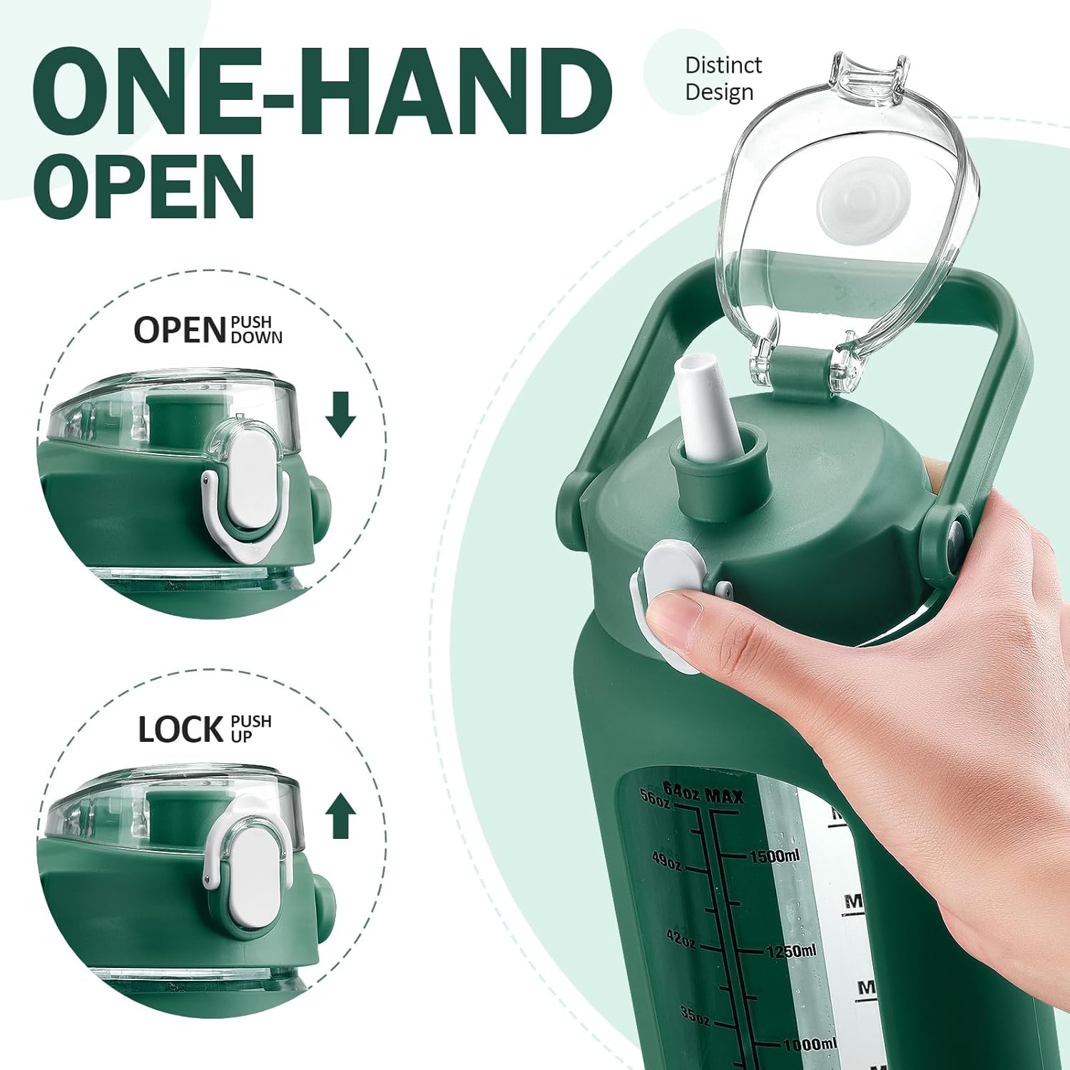 - ❤Glass Water Bottle with Pop-up Straw Lid- Our 64oz water bottle with straw is designed with an upgraded lid that ensures 100% leakproof and dustproof. Advanced one-click button makes you drink easier, just push the button and the straw will pop out automatically.