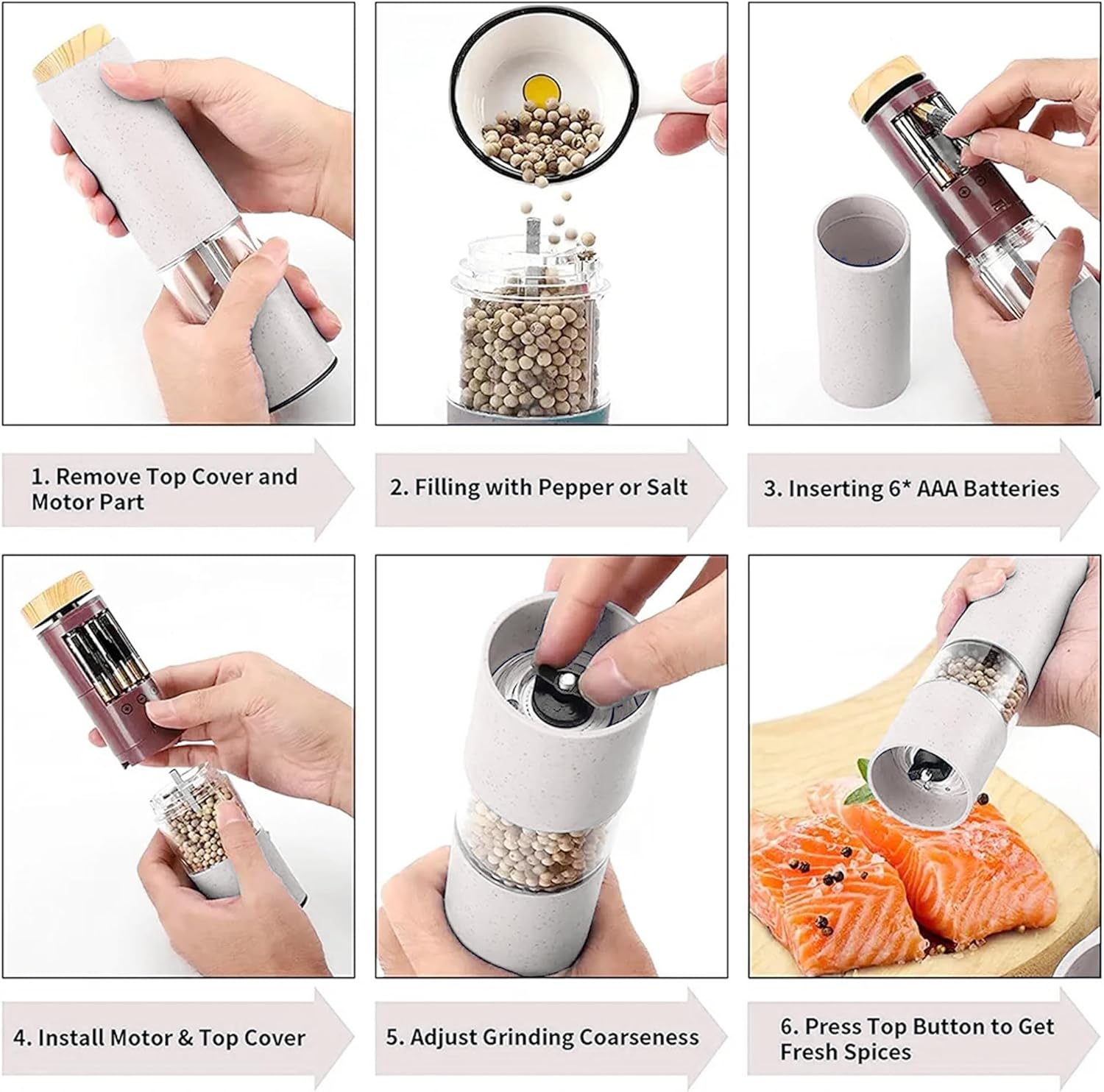 - 🧂🥓【Wide Applicability】The automatic salt and pepper grinder set is suitable for pepper, salt and other solid grain seasonings. 6 * AAA batteries ( not included ), convenient and fast, you can use it anytime and anywhere. This electric salt and pepper grinder is the good helper for kitchens, restaurants, parties and outdoor picnics.