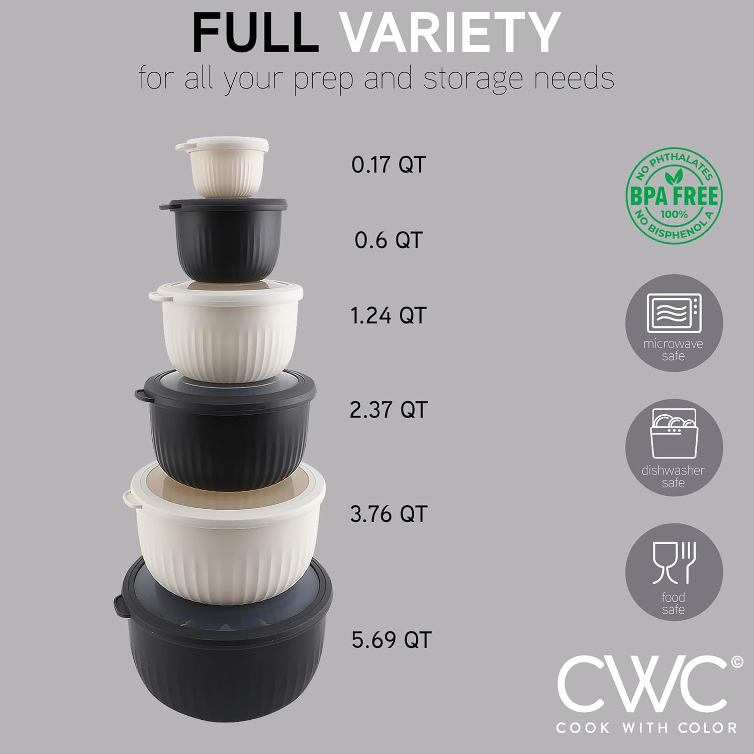 - Set Includes the great combination of small and medium size bowls: The sizes of our bowls are: .17 qt, .6 qt, 1.24 qt, 2.37 qt, 3.76 qt, 5.69 qt bowls with lids. A size for all your kitchen needs.