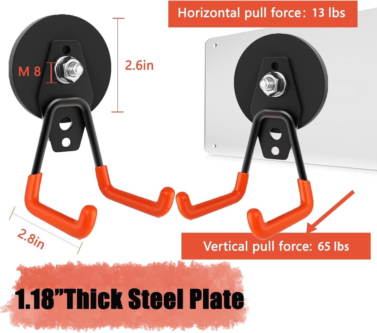 - π§²[Large Storage Magnetic Hooks]:These magnetic hooks includes 4 (2.6inch) strong magnet base with threaded bar, spacers,nuts and 4 PVC coated medium L hooks. We tested that our medium L magnetic hook can hold any kind of EV charger,more than one gallon bottled water, any kind of garage tool,drill, toolbox etc.