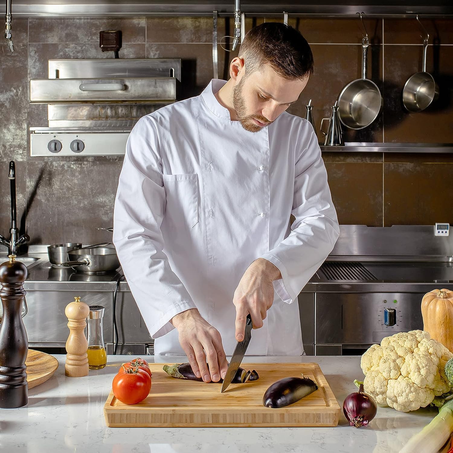 - High-quality materials: In order to enhance the durability of the chef's knife, high-quality high-carbon stainless steel with a carbon content of 0.6-0.75 is used, which makes its hardness twice that of other similar knives. The metal parts of the knife blade also contain 16-18% chromium, which gives it a smooth surface that won't discolor even after prolonged use
