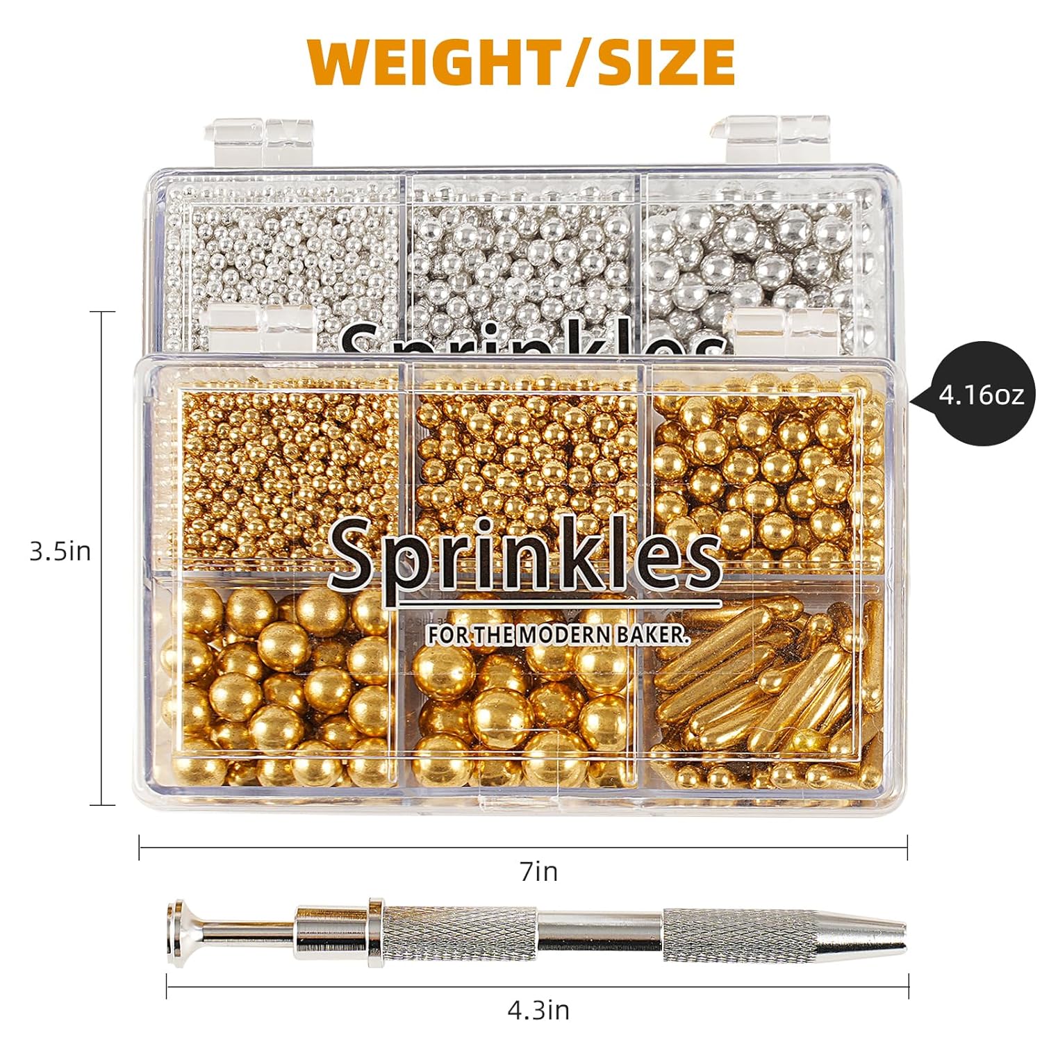 Kasvan Gold and Silver Sugar Sprinkles - Edible Candy Pearls with 4-Claw Sprinkle Pen,8.32Oz, Gift Box Pack, Baking Cake Decorations, Ice Cream Toppings and Cookie Decorating, Wedding Party Chirstmas Supplies
