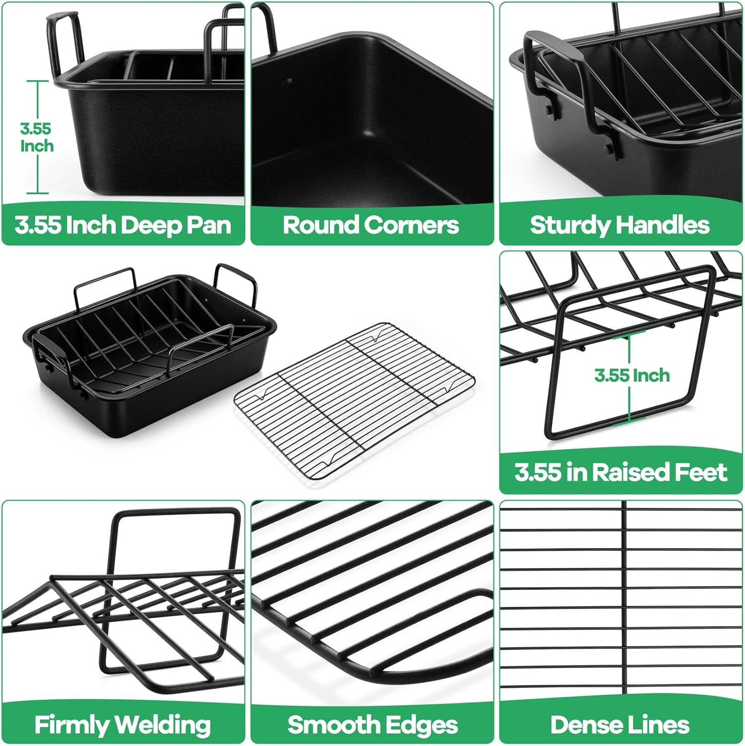 P&P CHEF 14" Roaster Roasting Pan with Baking Rack and V-shaped Rack, Stainless Steel Rectangular Lasagna Pan with Handles for Turkey Chicken, Healthy & Dishwasher Safe, 3 Pieces, Black