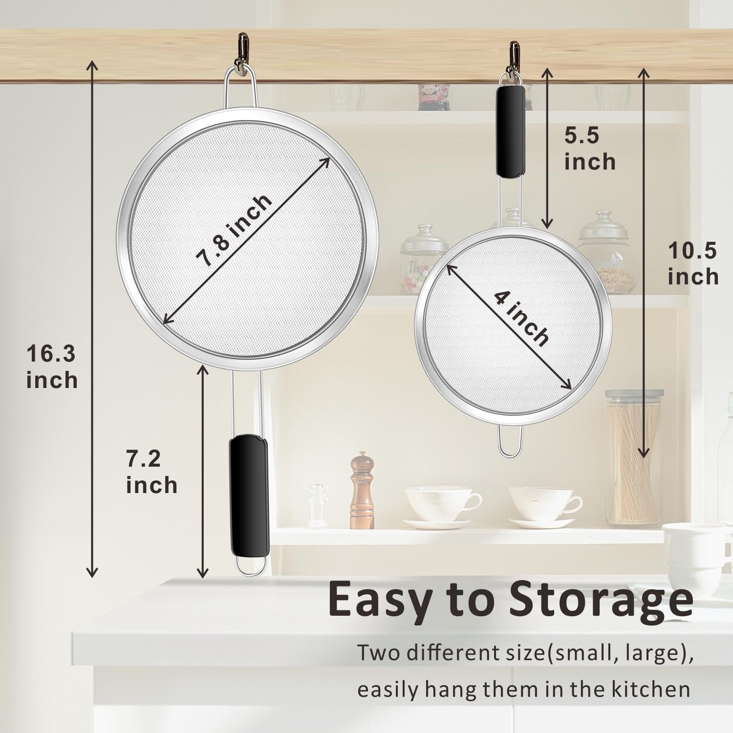 - HANDLE ALL YOUR TASKS-4" strainer perfect for tea, quinoa, powdered sugar or juice, and 7.8" strainer, perfect for pasta, which are the most popular and preferred sizes needed to handle all your straining, sieving, sifting, filtering and rinsing tasks. Nest the strainers together for space saving storage or hang them together within reach of where you use them the most.