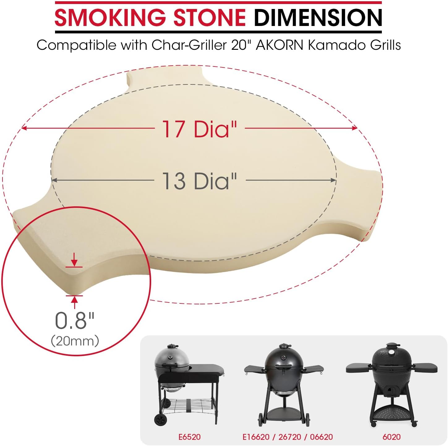 - Heat Deflector Dimension: Unicook smoking stone measures 17”Dia x 0.8”(20mm) thickness. Compatible with Char-Griller Akorn Kamado grill models: 16620, 26720, 06620, 6520, 6020, and large Big Green Egg