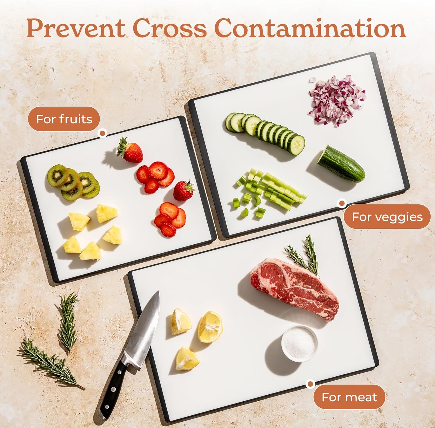 - 4-Pack with Holder: This cutting board set includes small, medium, and large cutting board sizes for every prep need. It also comes with a compact holder that neatly organizes all boards vertically, keeping your countertops clutter-free while ready for any chopping task.