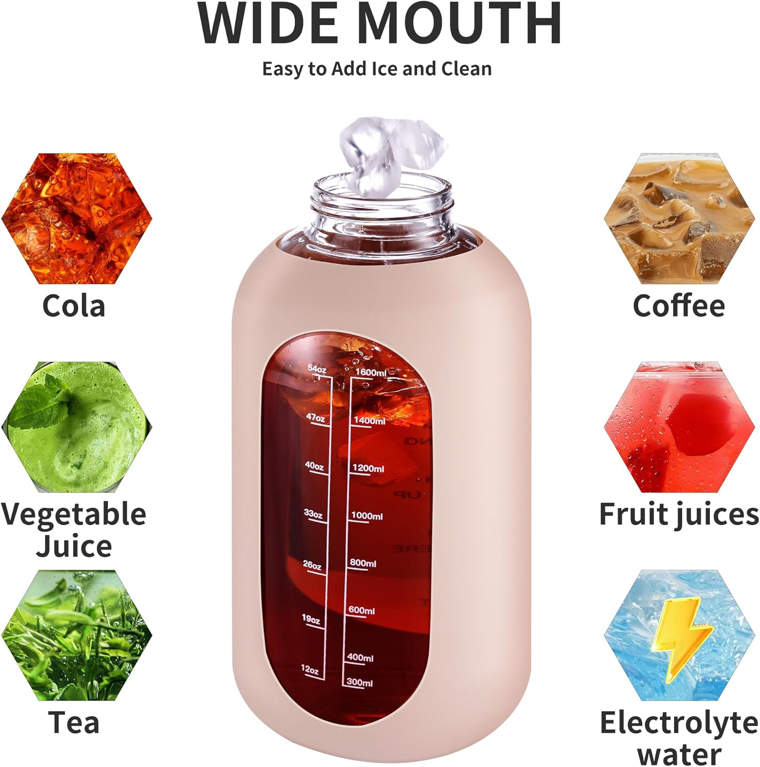 - SUITABLE OCCASIONS: The aesthetic glass water bottle is ideal for daily hydration at home and at work,solve the problem of not drinking enough water. It also serves as a motivational water bottle for the outdoors, gym sports, travel, picnic, etc
