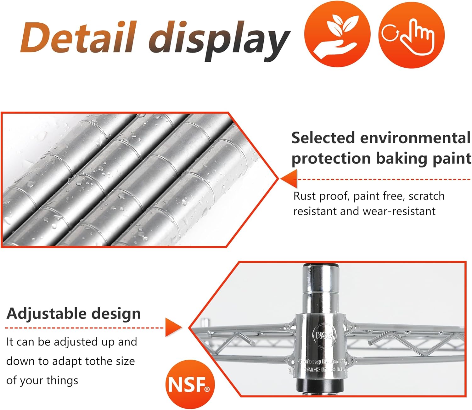 - 3.**Feet Levelers for Stability on Uneven Ground:** The included feet levelers ensure that the shelves remain stable even on uneven surfaces. No more wobbling or tilting, this wire shelving provides a secure storage solution for all your essentials. Keep your items safe and balanced regardless of the flooring in your space with this storage shelves.