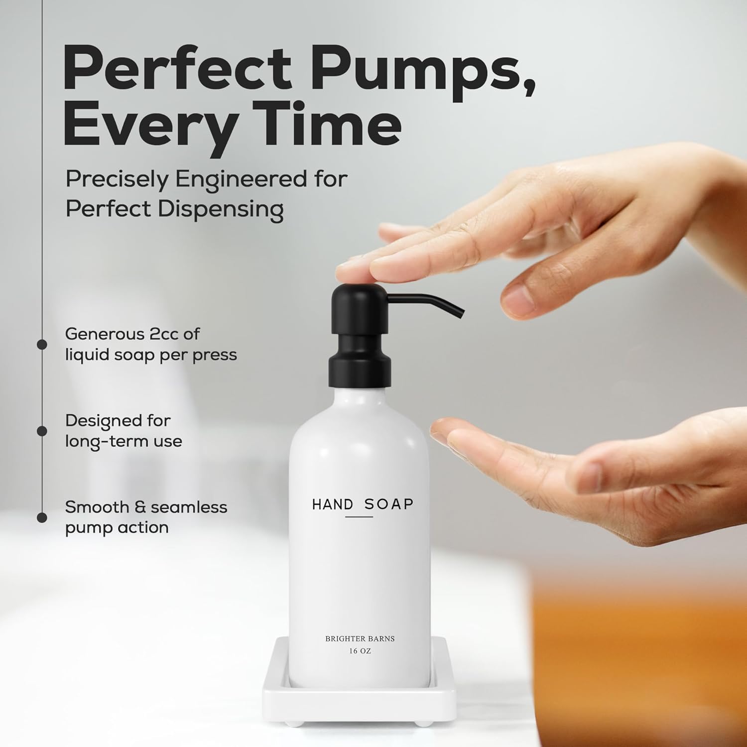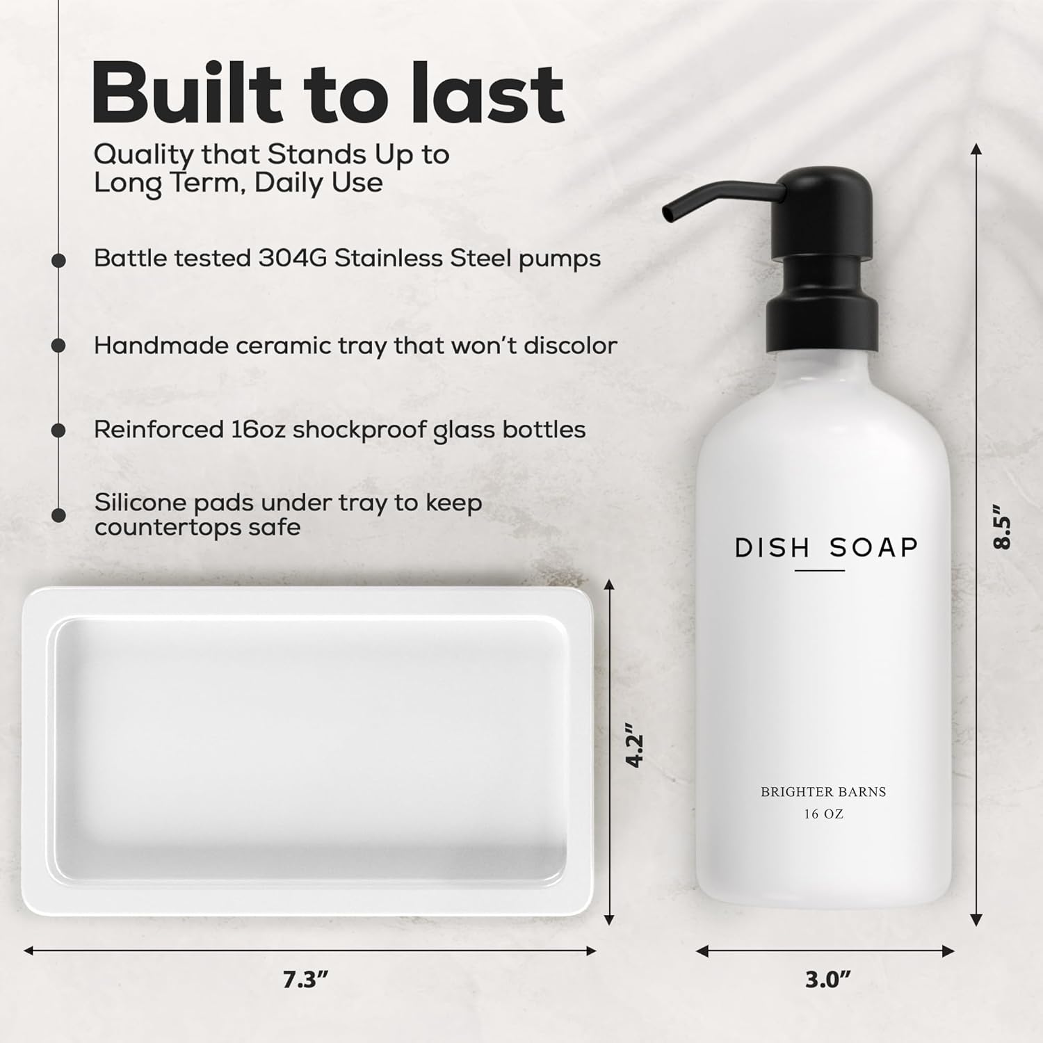 - AMERICAN DESIGN, UNCOMPROMISING QUALITY - Crafted with meticulous attention to detail, our glass soap dispenser with pump set features 2 robust 16oz glass bottles, corrosion-proof 304G stainless steel pumps, and a stain-resistant ceramic tray. All designed in the USA to provide unbeatable quality and enduring style that you can trust.